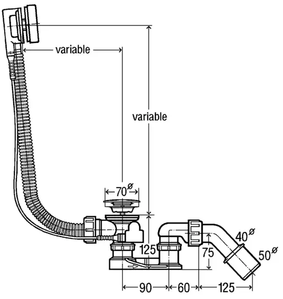 хромированная пробка донного клапана со штоком, гидрозатвор, сливное колено 45°, донный клапан - нержавеющая сталь.