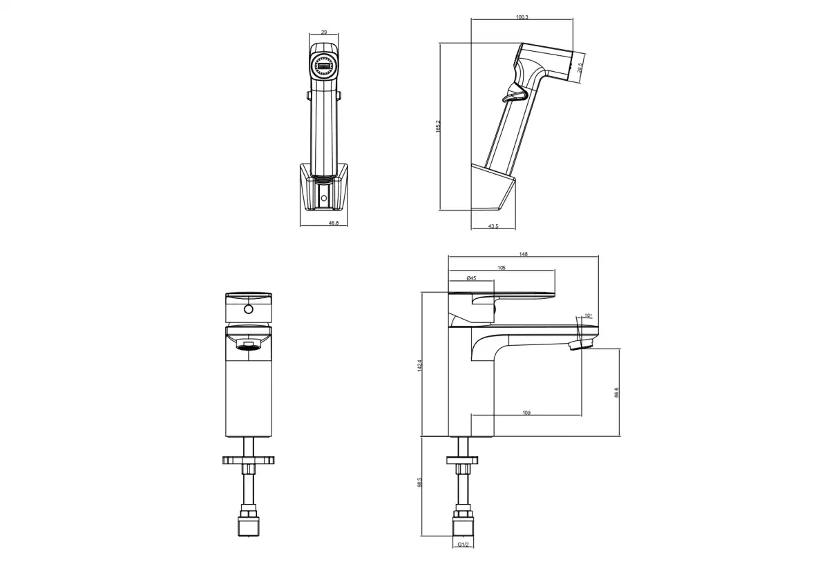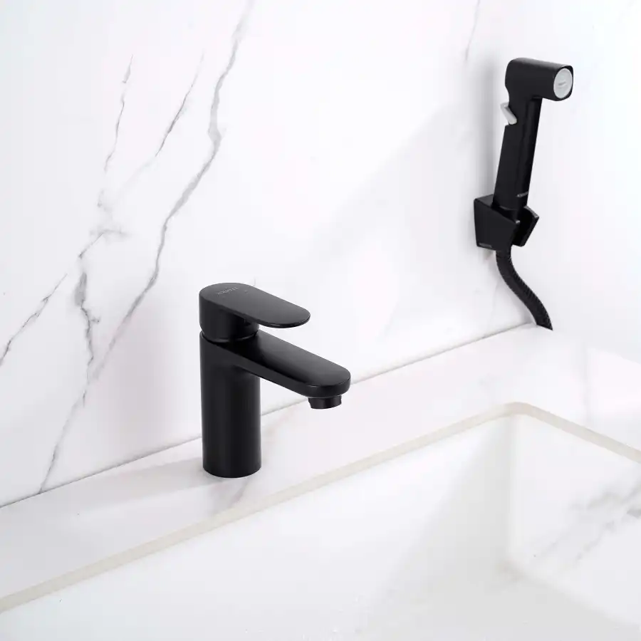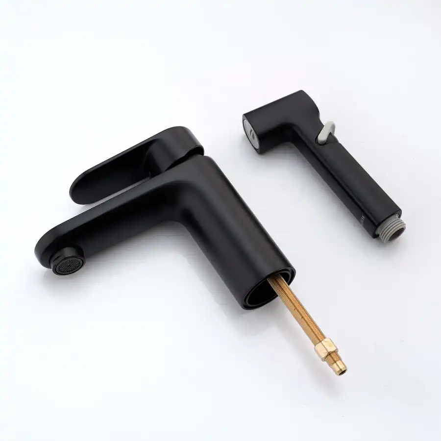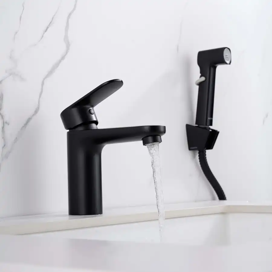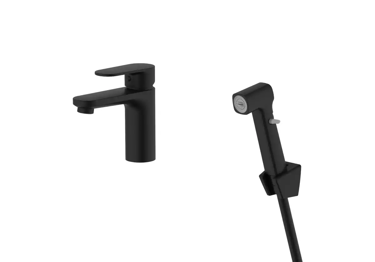 Aquatek | AQ1812MB НИКА смеситель для раковины 90 без донного клапана с гигиеническим ручным душем, матовый черный.