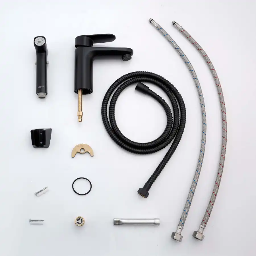 Комплектация1. Смеситель 2. Гибкая подводка 60см 3. Шланг для лейки 150 см 4. Гигиеническая лейка, оснащена нажимным механизмом для остановки потока воды 5. Настенный держатель для гигиеническ