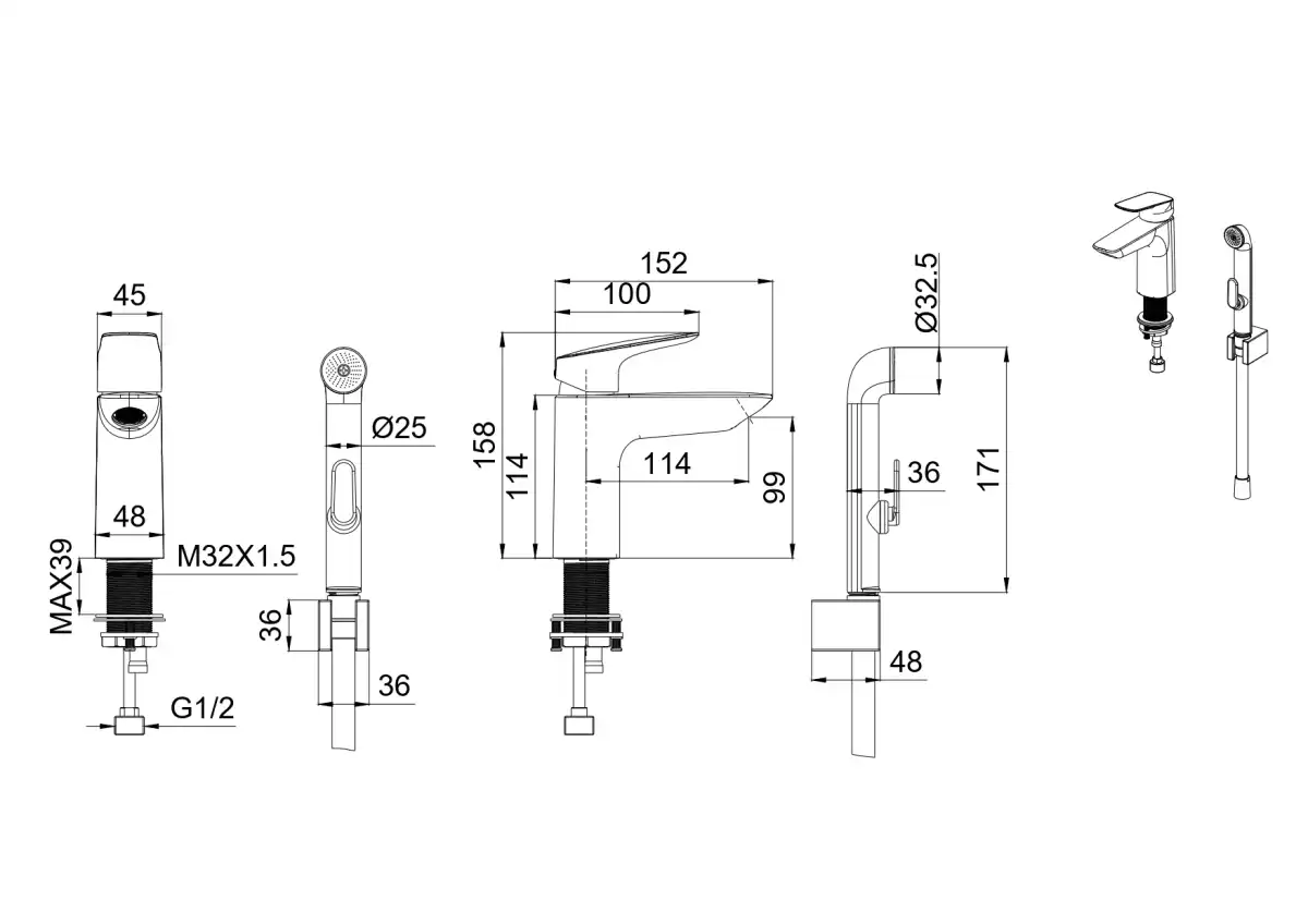 Комплектация1. Смеситель 2. Гибкая подводка 50см 3. Шланг для лейки 150 см 4. Гигиеническая лейка, размер лейки 173*54 мм, оснащена нажимным механизмом для остановки потока воды 5. Настенный д