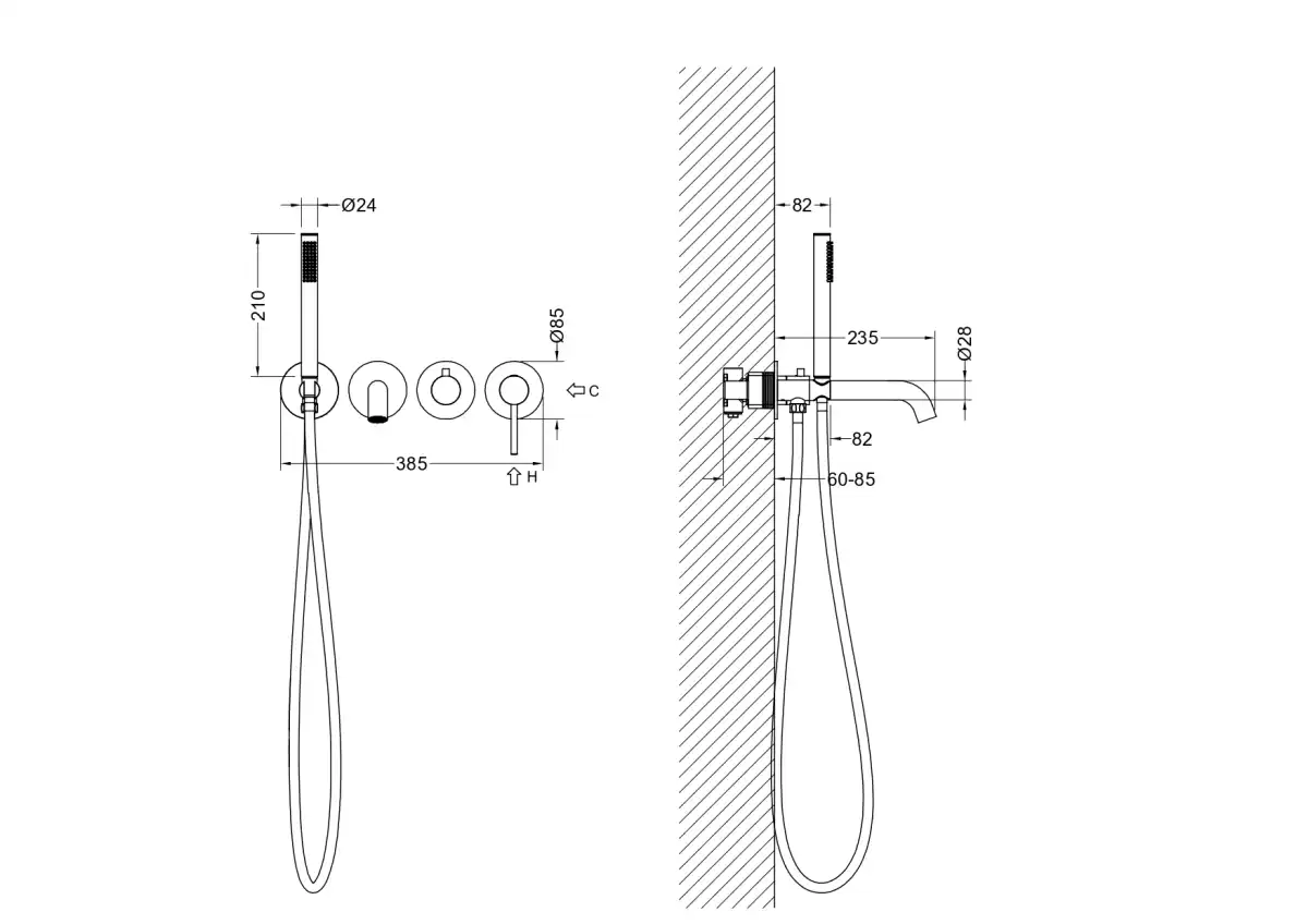Комплектация1. Смеситель для ванны (внешняя и скрытая часть) 2. Излив смесителя 3. Дивертор (переключатель потоков) 4. Душевой гарнитур: гигиеническая лейка, шлан 1,5м 5. Декоративная накладка