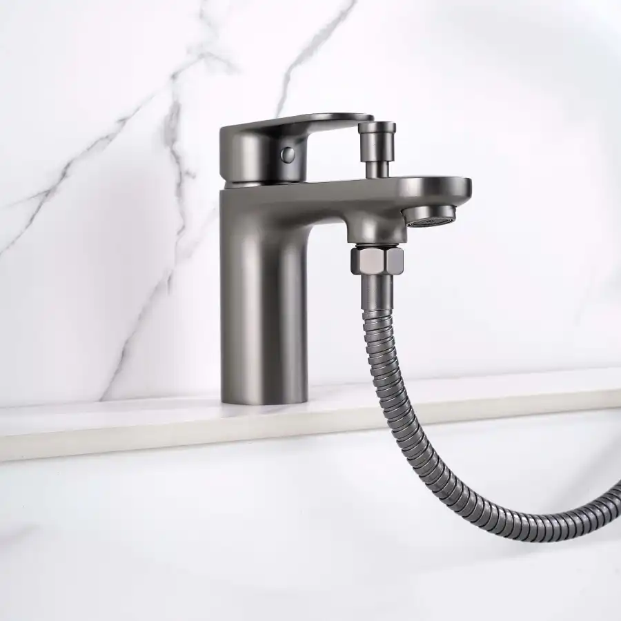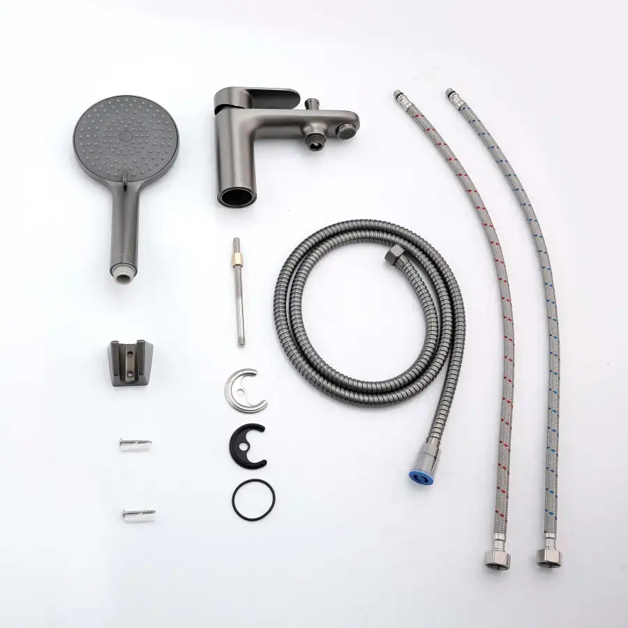 Комплектация1. Смеситель 2. Гибкая подводка 60см 3. Шланг для лейки 150 см 4. Лейка ручного душа 5. Настенный держатель для ручной лейки