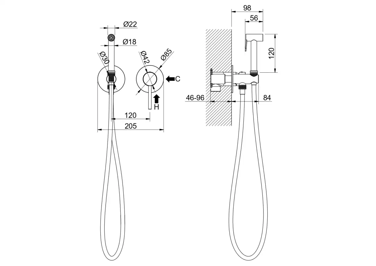 Комплектация1. Смеситель для гигиенического душа (внешняя и скрытая часть) 2. Душевой гарнитур: гигиеническая лейка, шланг, шланговое подсоединение с держателем 3. Декоративные накладки на сте