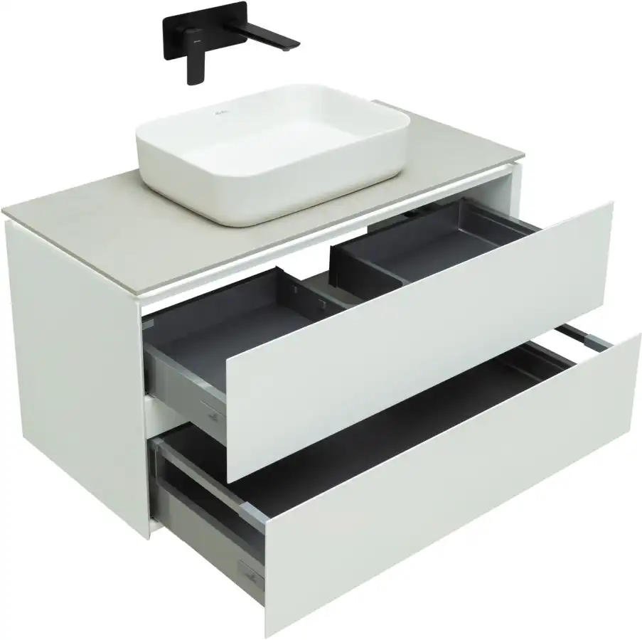 Плавное закрывание ящиков, полное выдвижение, прочное дно (толщина 16 мм), нагрузка до 30 кг.