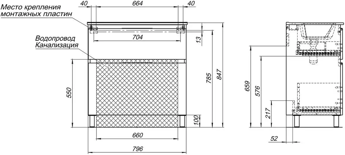 Металлические опоры не только придают тумбе устойчивость, но и облегчают уборку под ней. Благодаря предусмотренному месту для подводки коммуникаций, установка тумбы не составит труда.