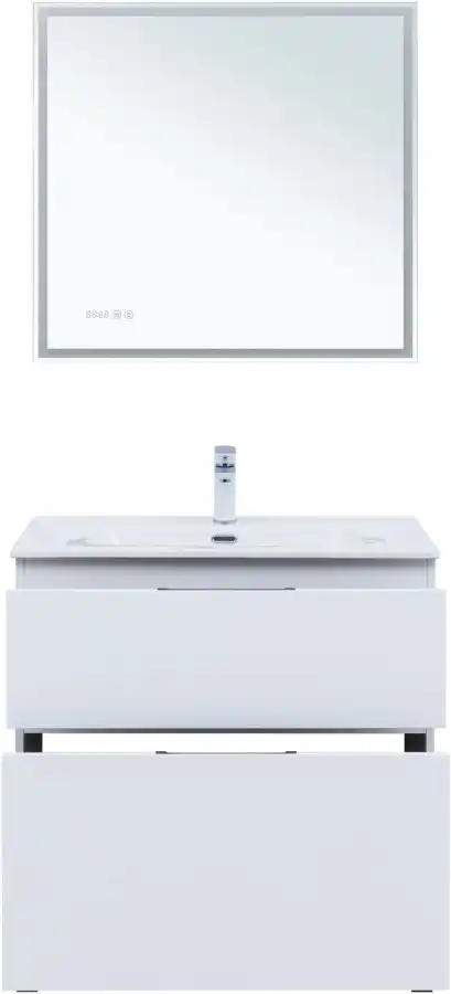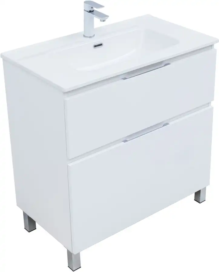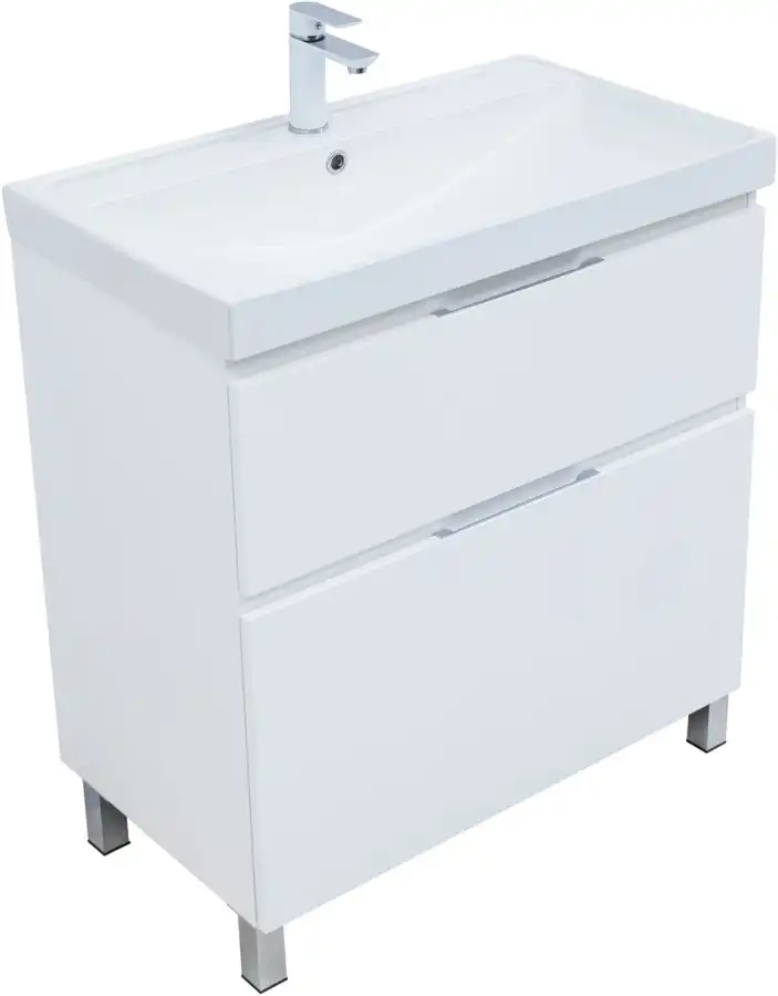 Материал корпуса - влагостойкая ЛДСП, покрытие эмаль белый матовый. Материал фасадов - влагостойкая ЛДСП, покрытие эмаль белый матовый. Направляющие скрытого монтажа с доводчиками. Удобная ручка в цвете хром глянец на верхнем торце фасадов. Надежные навесы, выдерживают нагрузку до 130 кг. Металлические опоры (4 шт, высота 100 мм) - в комплекте. Пластиковое ограждение сифона в сером цвете. Прочное дно нижнего ящика - изготовлено из влагостойкой ЛДСП толщиной 16 мм. В тумбах за нижним ящиком предусмотрено место для подводки коммуникаций снизу.
