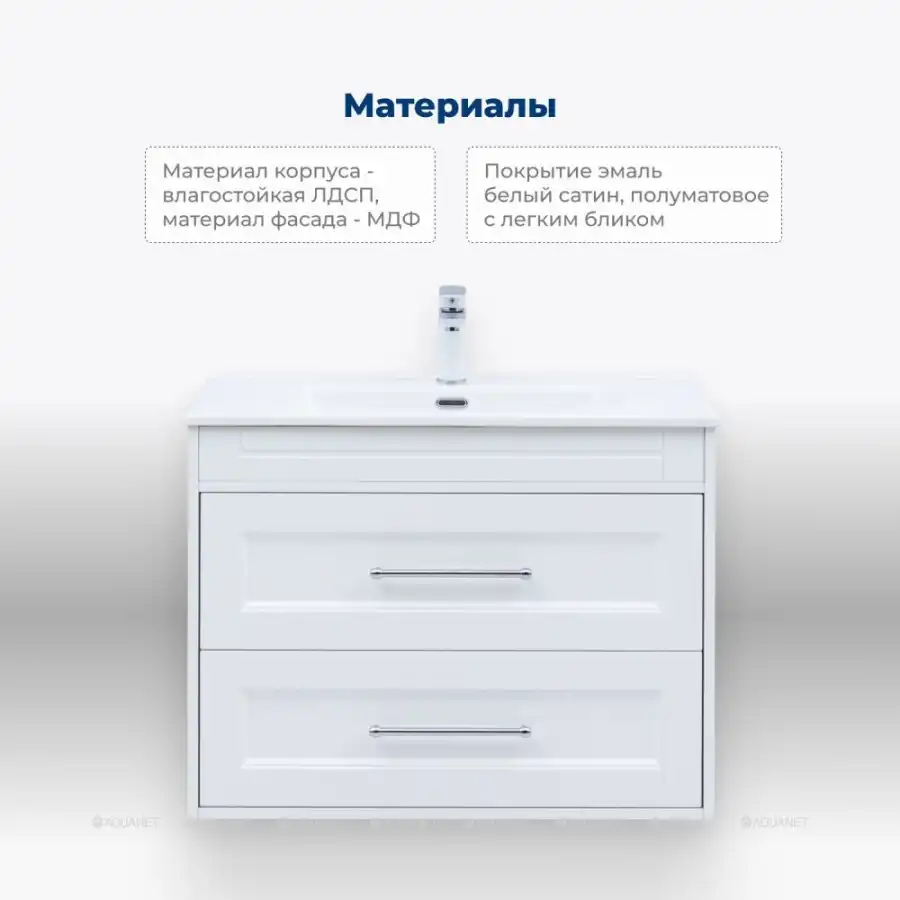 Корпус изготовлен из влагостойкой ЛДСП с эмалевым покрытием белый сатин. Фасады выполнены из МДФ с таким же покрытием, что придает мебели гармоничный внешний вид. Внутренние элементы — влагостойкая ЛДСП в цвете антрацит, что делает конструкцию не только прочной, но и эстетичной.