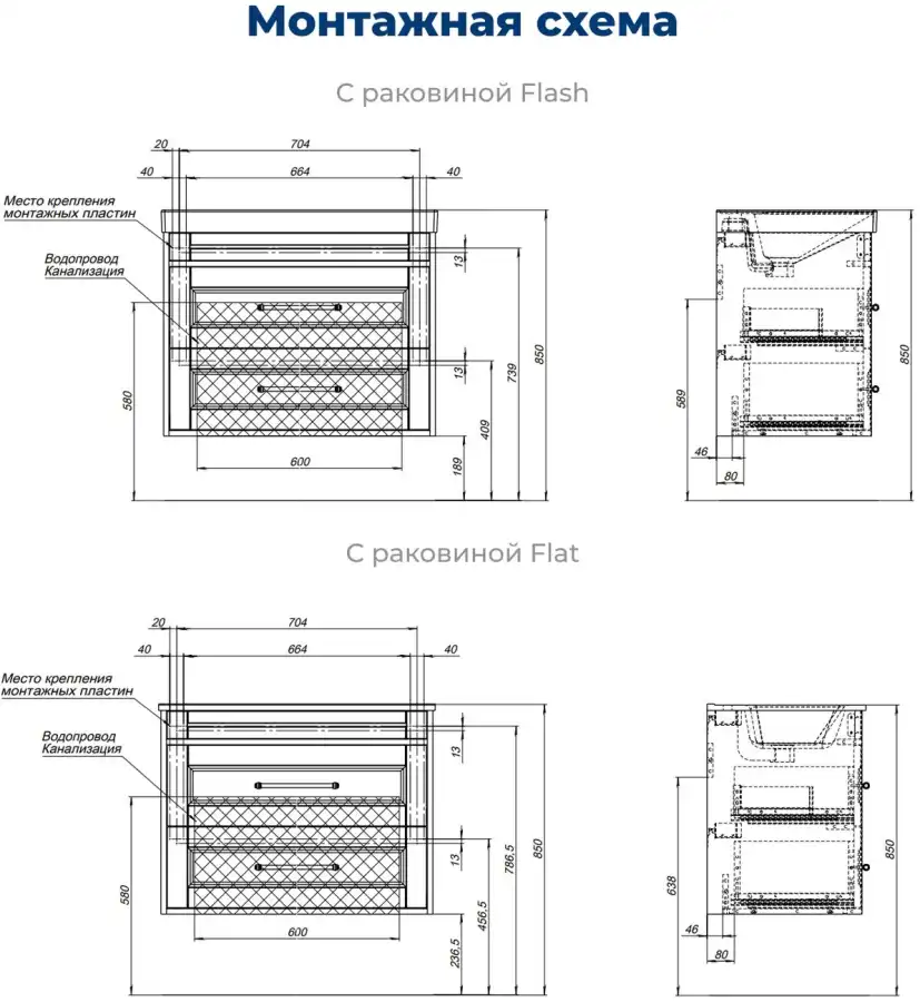 В нижней части предусмотрено пространство для подводки коммуникаций, что упрощает монтаж и скрывает трубы.