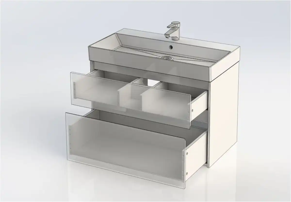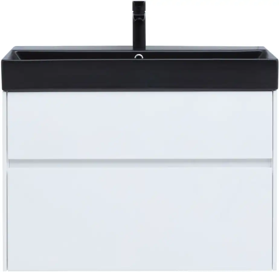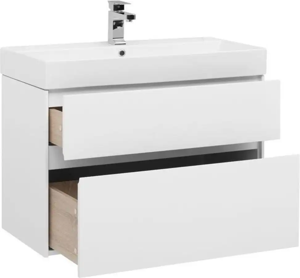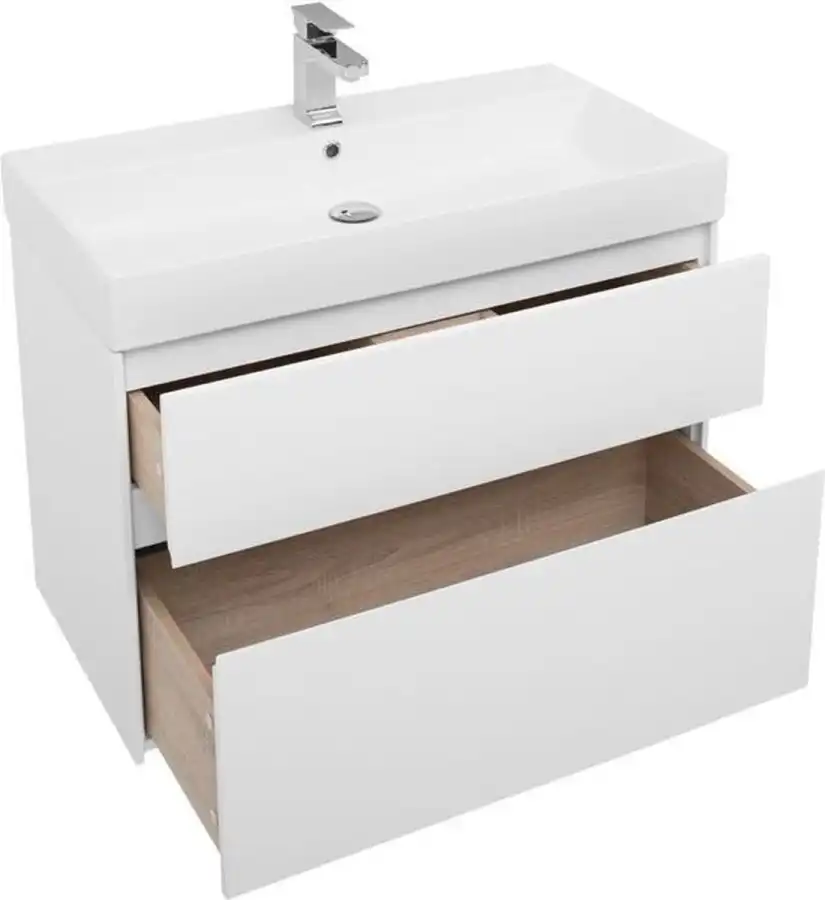 Тумба с раковиной Aquanet Бруклин 85 белого цвета предназначена для подвесной установки. Изделие отвечает тенденциям минимализма. Аскетизм четких линий и обтекаемых форм в ней доведен до совершенства. В модели нет никаких выделяющихся деталей, и даже ручки интегрированные, когда открывание происходит за счет выступающей детали верхней или нижней части фасада, которая срезана под углом, в результате чего образуется выемка, служащая ручкой. В тумбе ручка устроена таким образом у верхнего ящика в нижней части фасада, а у нижнего – в верхней. Такое простое решение добавляет изысканности внешнему виду изделия. Раковина из керамики с тонкими изящными бортиками идет размер в размер с тумбой, ширина которой 85 см, в результате чего все изделие выглядит как единое целое. Корпус изделия выполнен из выкрашенного белой краской влагостойкого ЛДСП, фасады – из МДФ. На контрасте с белизной внешних деталей стильно смотрится корпус выдвижных ящиков, выполненный в цвете «дуб сонома». Нижний ящик тумбы имеет большую зону хранения, верхний разделен на несколько отделений, которые помогут грамотно разложить все необходимое по своим местам.