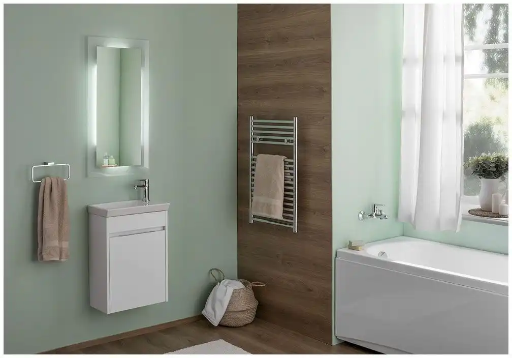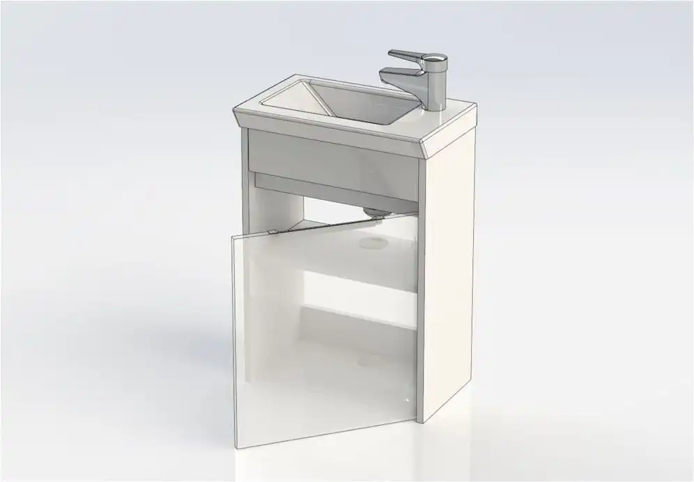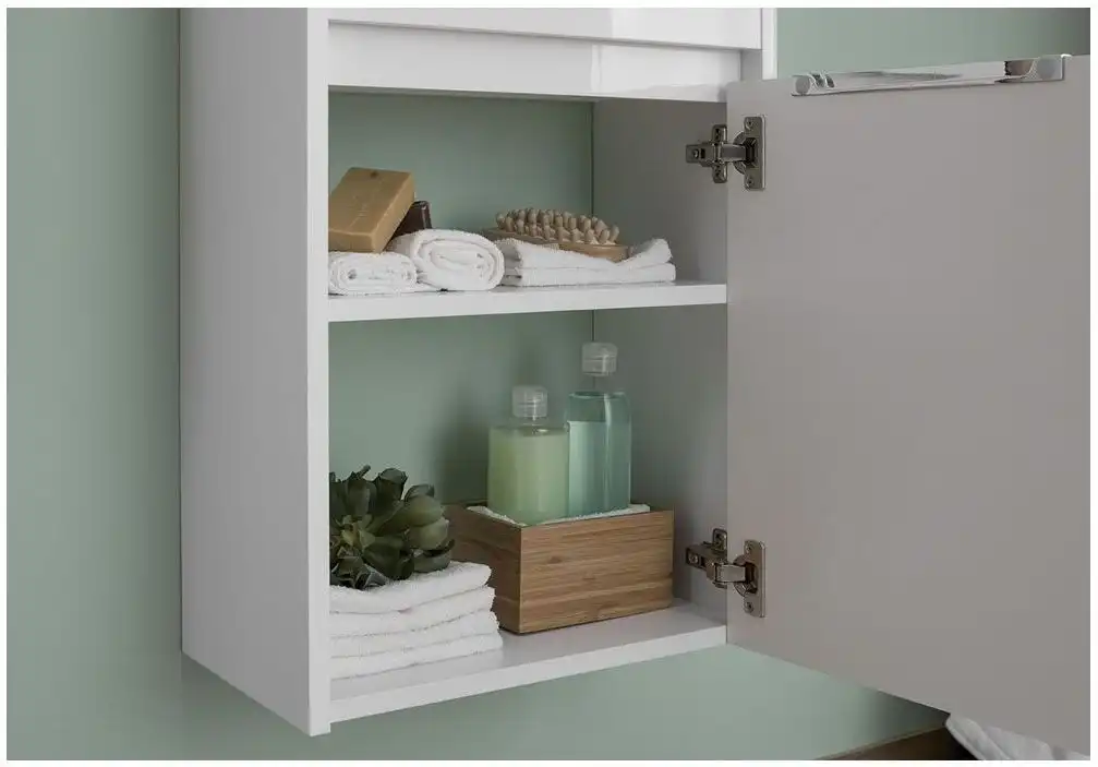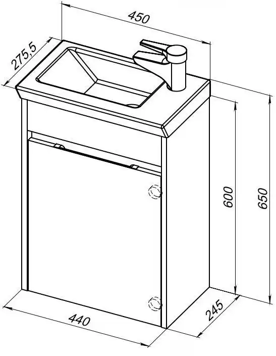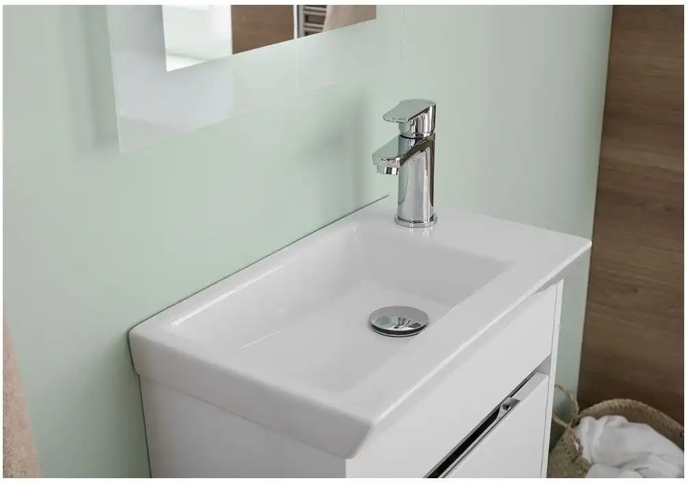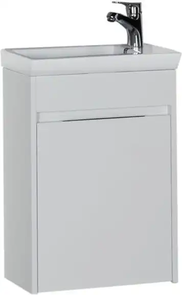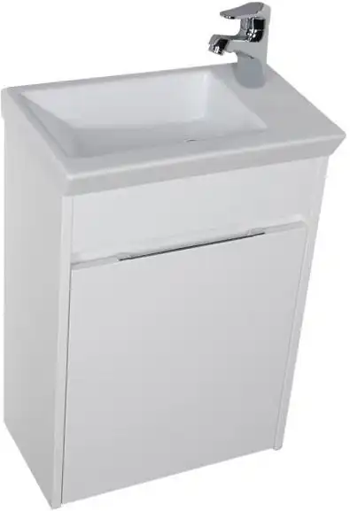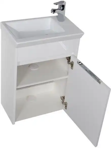 В тумбе предусмотрены просторные полки, а столешницей служит глубокая прямоугольная керамическая раковина. Отверстие под смеситель для удобства расположен по правую руку.