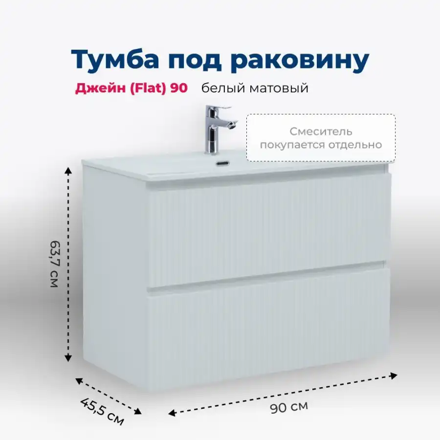 Тумба под раковину Aquanet Джейн (Flat) 90 см, подвесная, цвет Белый, 335425. Раковина приобретается отдельно.