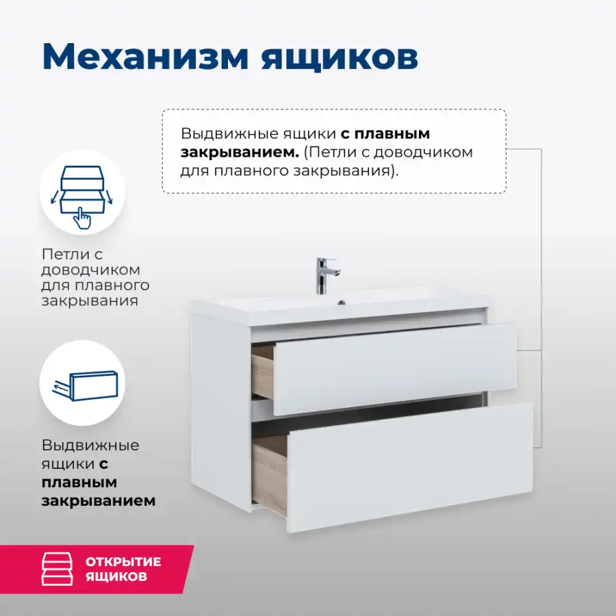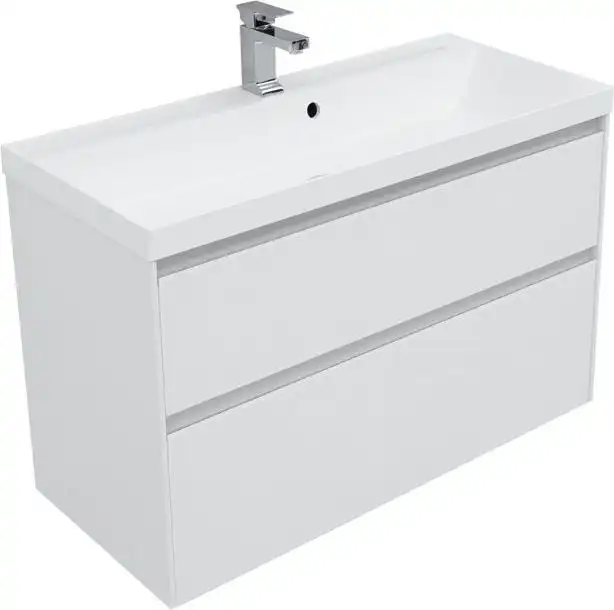 Тумба с раковиной Aquanet «Гласс» 100 белого цвета. Мебель дополнена двумя широкими и вместительными ящиками. Для их открывания применяют скрытые рукоятки, которые придают поверхности эстетичный внешний вид и не цепляются за одежду. Корпус изготовлен из МДФ. Специальное покрытие позволяет вести эксплуатацию в условиях высокой влажности. Размеры — 990х445х610 мм. На прямоугольной раковине «Орлеан» 100 размещено отверстие под кран. Основной материал — литьевой мрамор, отличающийся гладкостью и гипоаллергенностью. Он не впитывает запахи и сохраняет свою белизну в течение всего срока службы. Рекомендуем составить комплект из пенала «Гласс» 35, зеркало-шкафа «Латина» 100. Сверху можно разместить Aquanet WT-400 LED. Для напольной установки используют ножки (артикул 00181454), для крепления к стене — дюбели.