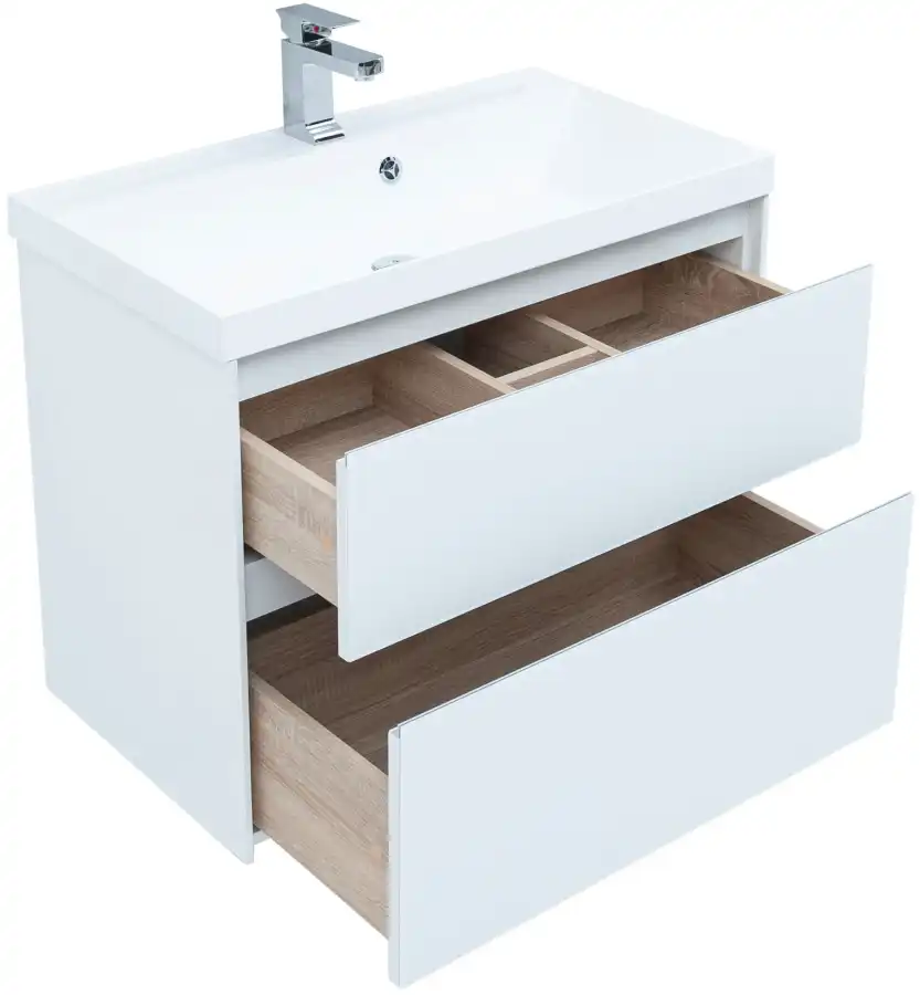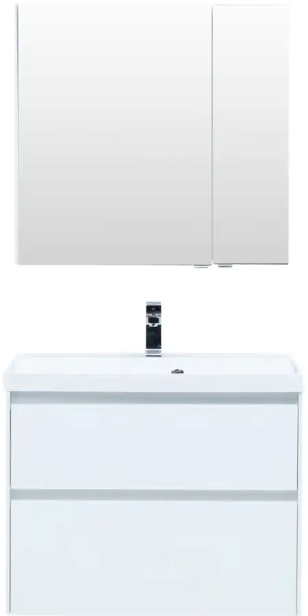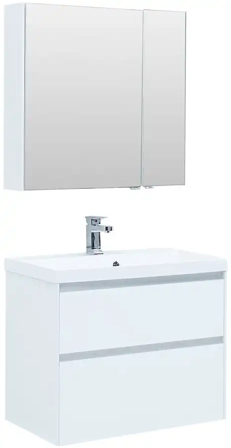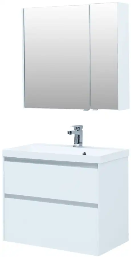 Тумба с раковиной Aquanet «Гласс» 80 крепят к стене или устанавливают на четыре ножки высотой 200 мм (не входят в набор, артикул 00181454). Для изготовления корпуса использован материал МДФ белого цвета, который подходит для эксплуатации в условиях повышенной влажности. Шкафчики оснащены доводчиком и позволяют компактно хранить бытовую химию, гигиенические принадлежности и косметику. Габариты — 790х445х610 мм. Раковина Aquanet «Орлеан» 80 с широкой и объемной чашей сделана из безопасного и экологичного, устойчивого к высоким температурам литьевого мрамора. В центральной части бортика расположено отверстие для смесителя. Размеры — 800х450 мм. Дополнить комплект можно зеркальным шкафом «Латина» 80 (артикул 00179635) пеналом «Гласс» 35 (артикул 00196962) от производителя Aquanet, смесителем из серии Infinity (артикул 5.21001-00) от Allen Brau.