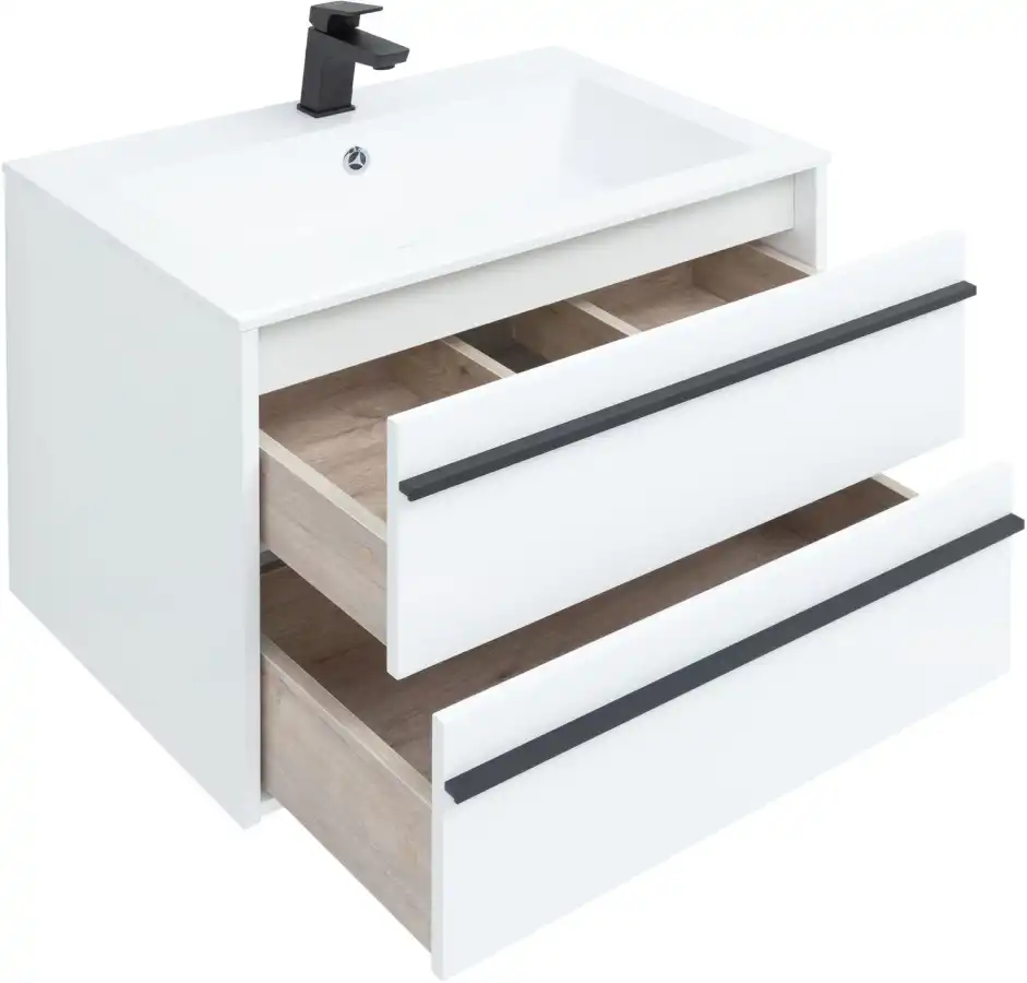 Тумба с раковиной Aquanet Lino 70 белый матовый - яркий пример мебели в эко-стиле. У нее удобная зона хранения: два выдвижных ящика, оборудованных доводчиками, словно утоплены внутрь корпуса. Тонкие изящные ручки во всю ширину ящиков. Именно они находятся в одной плоскости с боковыми стенками. Выглядит стильно. К тому же, безопасно, так как нет выступающих деталей. Кстати, ручки отечественного производства. Сделаны из алюминия, чтобы исключить возможность коррозии, по заказу Aquanet специально для этой коллекции. Сверху на них нанесено эмалевое покрытие. Сверху – раковина «Электра» из литьевого мрамора. У нее максимально глубокая и объемная чаша, но все внутренние детали скруглены, так что приведение ее в порядок не составит труда, так как грязь не будет скапливаться в уголках. Корпус и фасады тумбы шириной 70 см – из влагостойкого ЛДСП, внутренняя часть ящиков выполнена в цвете «дуб кантри», что создает легкий контраст белоснежным деталям корпуса и фасада.