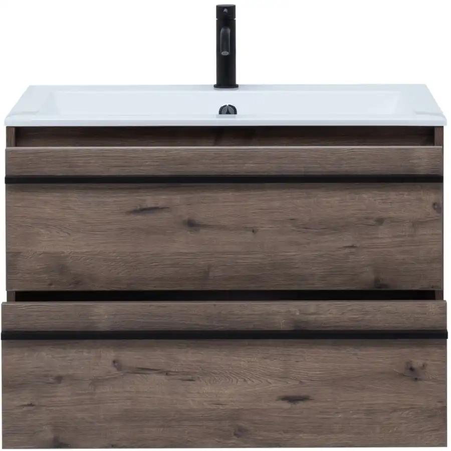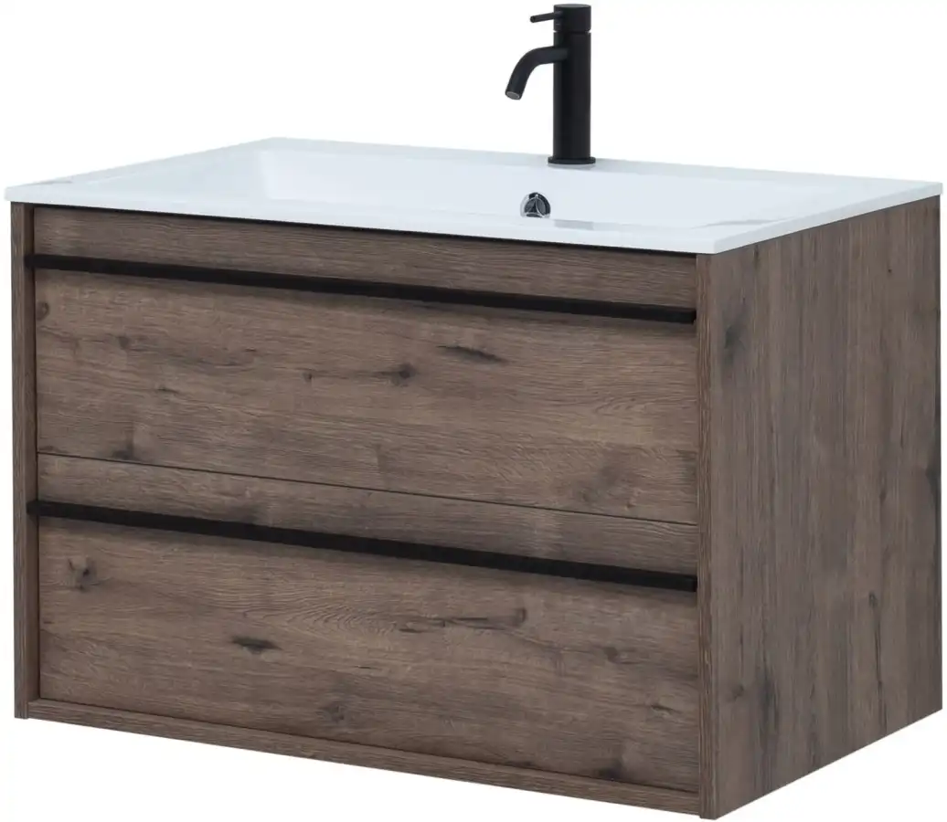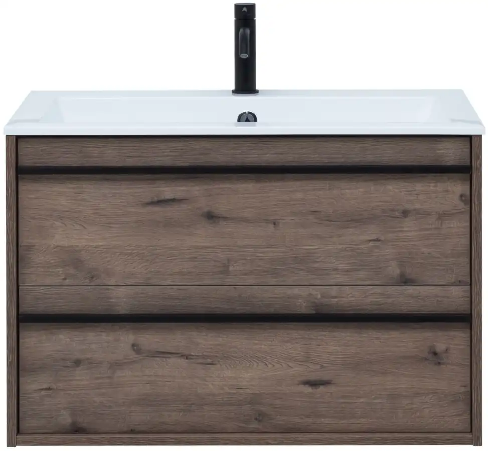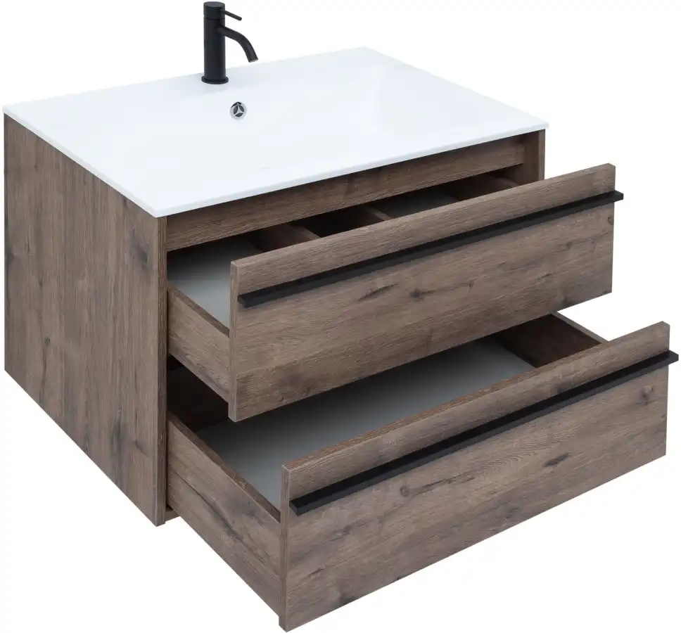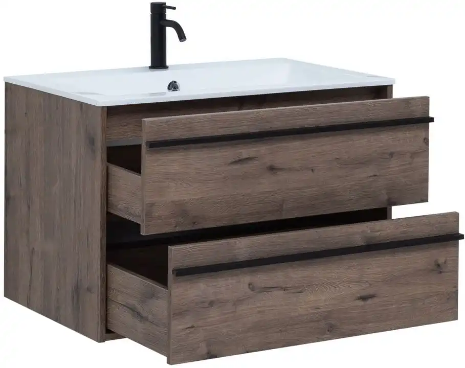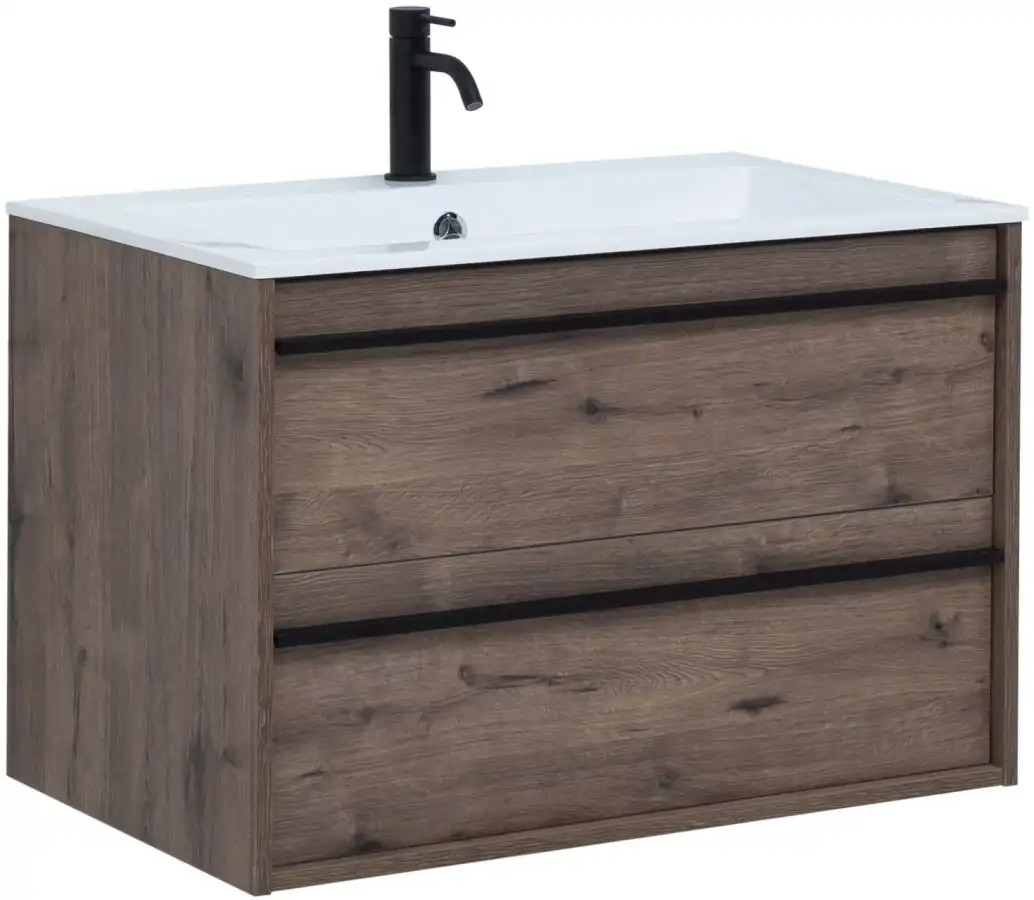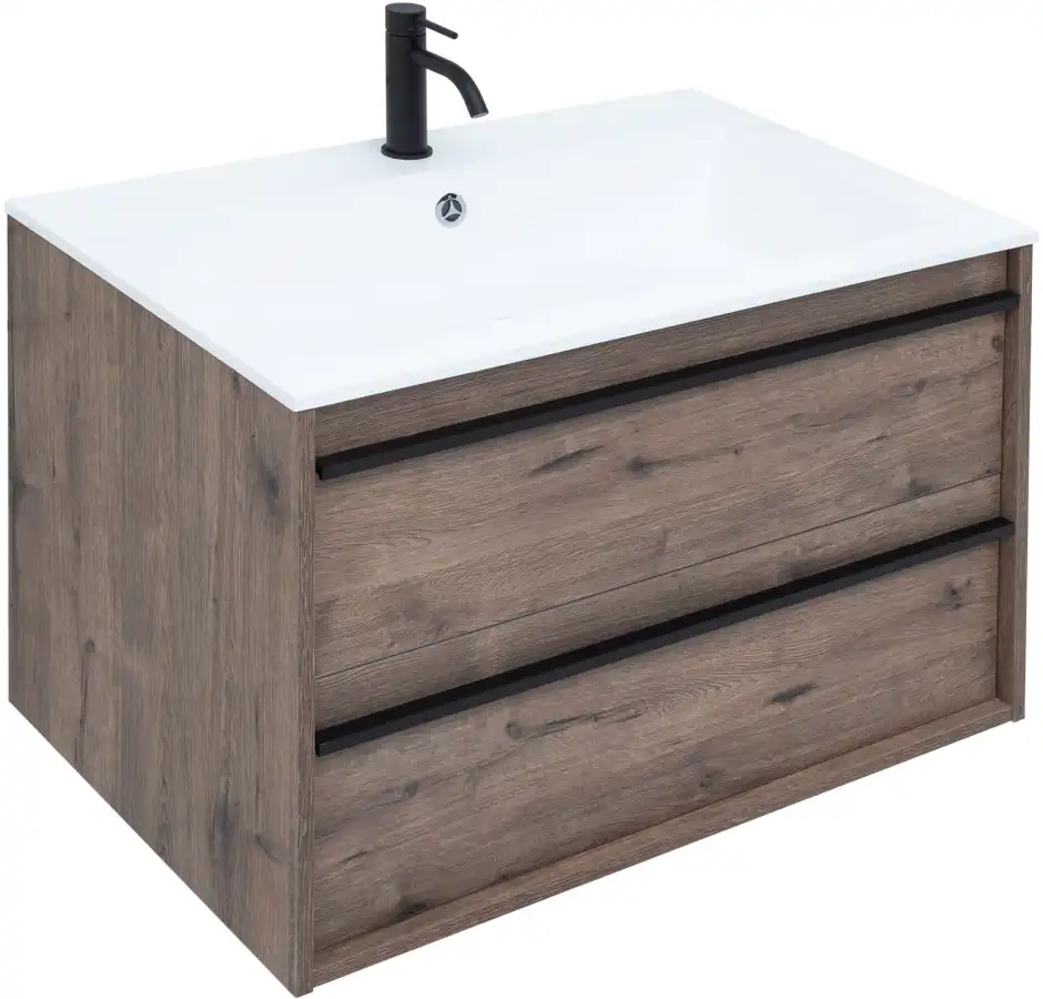 Тумба с раковиной Aquanet Lino 80 в цвете "дуб веллингтон" - яркий пример мебели в эко-стиле. Яркая, приятная глазу цветовая гамма плюс текстурная поверхность, максимально приближенная по тактильным ощущениям к натуральной древесной поверхности, является визитной карточкой коллекции. У нее удобная зона хранения: два выдвижных ящика, оборудованных доводчиками, словно утоплены внутрь корпуса. Тонкие изящные ручки во всю ширину ящиков. Именно они находятся в одной плоскости с боковыми стенками. Выглядит стильно. К тому же, безопасно, так как нет выступающих деталей. Кстати, ручки отечественного производства. Сделаны из алюминия, чтобы исключить возможность коррозии, по заказу Aquanet специально для этой коллекции. Сверху на них нанесено эмалевое покрытие. Корпус и фасады тумбы шириной 80 см – из влагостойкого ЛДСП. Сверху установлена раковина «Электра» из литьевого мрамора. У нее максимально глубокая и объемная чаша, но все внутренние детали скруглены, так что приведение ее в порядок не составит труда, так как грязь не будет скапливаться в уголках.