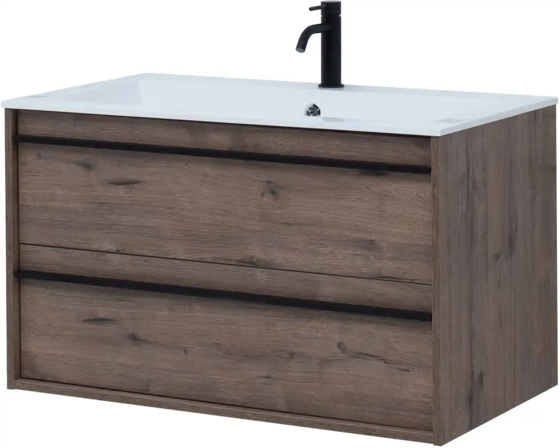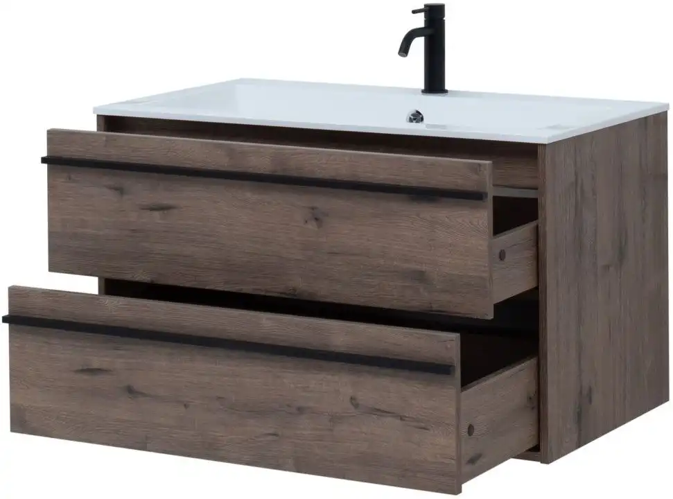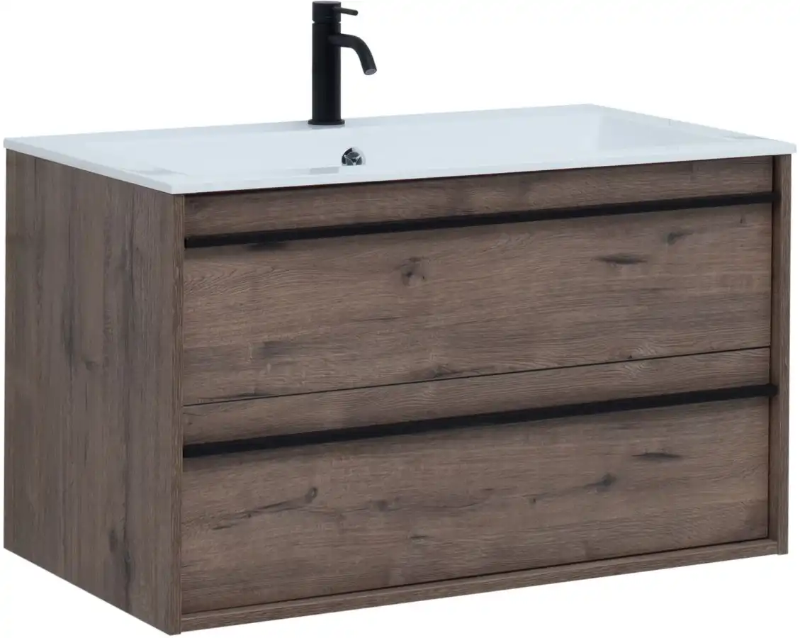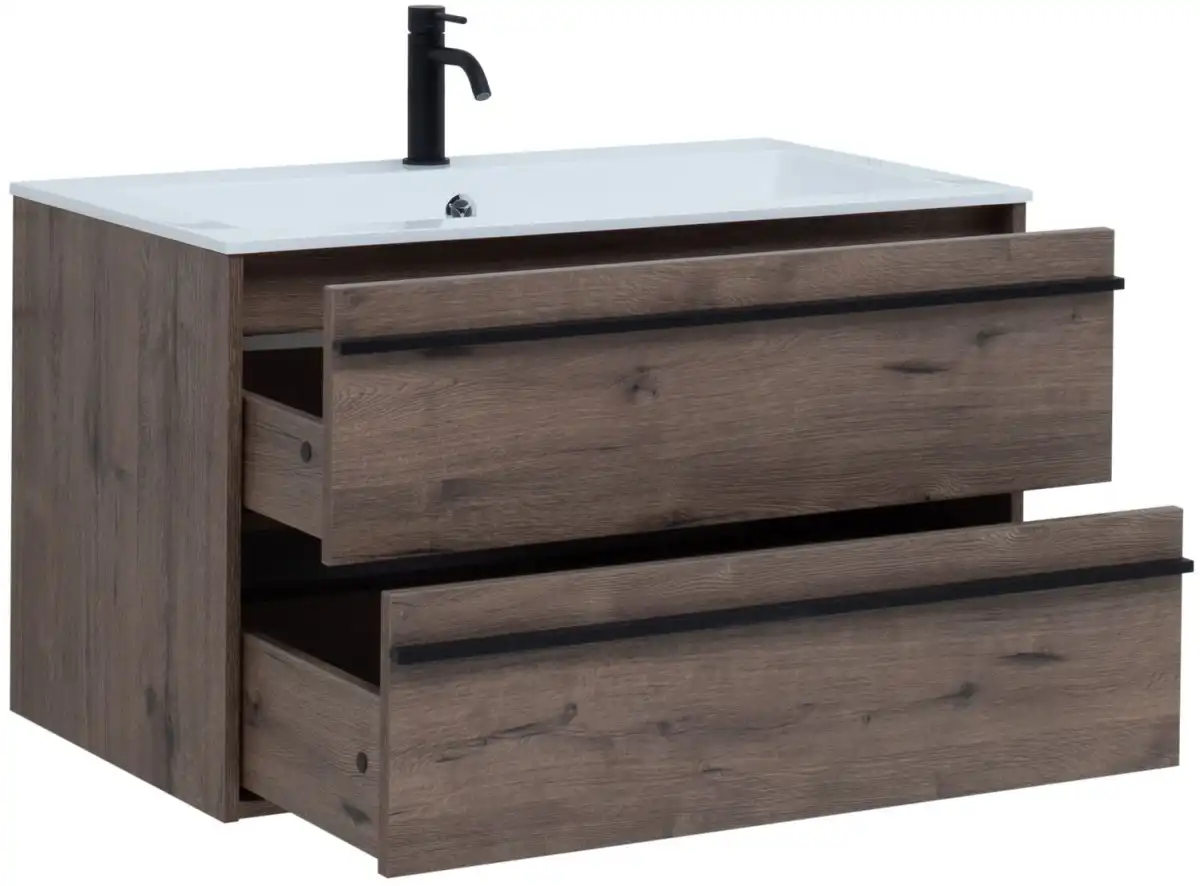 Тумба с раковиной Aquanet Lino 90 в цвете "дуб веллингтон" - яркий пример мебели в эко-стиле. Яркая, приятная глазу цветовая гамма плюс текстурная поверхность, максимально приближенная по тактильным ощущениям к натуральной древесной поверхности, является визитной карточкой коллекции. У нее удобная зона хранения: два выдвижных ящика, оборудованных доводчиками, словно утоплены внутрь корпуса. Тонкие изящные ручки во всю ширину ящиков. Именно они находятся в одной плоскости с боковыми стенками. Выглядит стильно. К тому же, безопасно, так как нет выступающих деталей. Кстати, ручки отечественного производства. Сделаны из алюминия, чтобы исключить возможность коррозии, по заказу Aquanet специально для этой коллекции. Сверху на них нанесено эмалевое покрытие. Корпус и фасады тумбы шириной 90 см – из влагостойкого ЛДСП. Сверху установлена раковина «Электра» из литьевого мрамора. У нее максимально глубокая и объемная чаша, но все внутренние детали скруглены, так что приведение ее в порядок не составит труда, так как грязь не будет скапливаться в уголках.