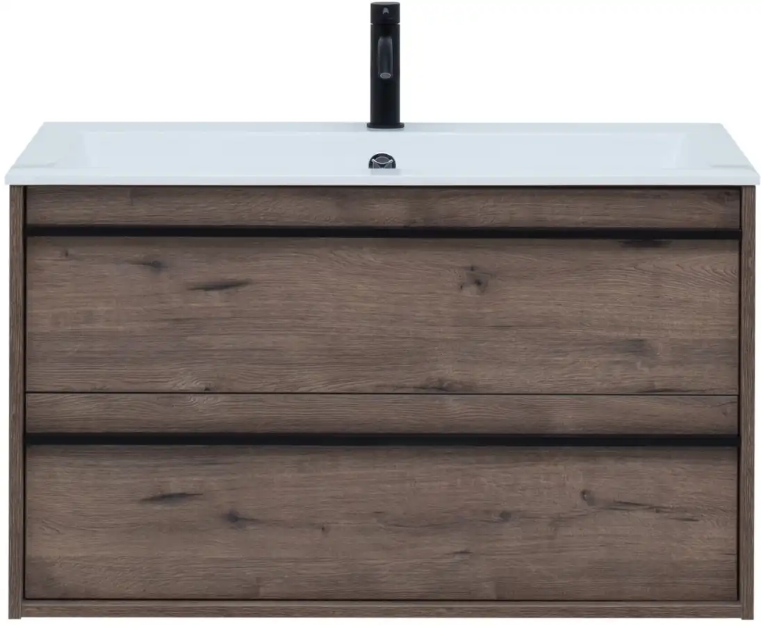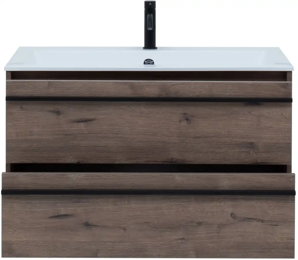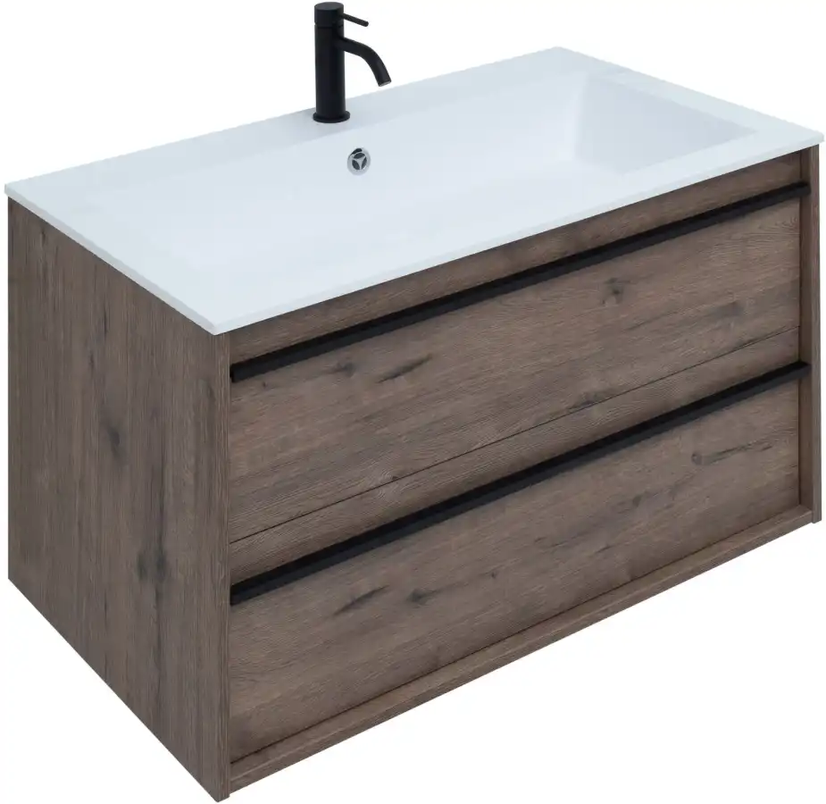 Тумба с раковиной Aquanet Lino 90 в цвете "дуб веллингтон" - яркий пример мебели в эко-стиле. Яркая, приятная глазу цветовая гамма плюс текстурная поверхность, максимально приближенная по тактильным ощущениям к натуральной древесной поверхности, является визитной карточкой коллекции. У нее удобная зона хранения: два выдвижных ящика, оборудованных доводчиками, словно утоплены внутрь корпуса. Тонкие изящные ручки во всю ширину ящиков. Именно они находятся в одной плоскости с боковыми стенками. Выглядит стильно. К тому же, безопасно, так как нет выступающих деталей. Кстати, ручки отечественного производства. Сделаны из алюминия, чтобы исключить возможность коррозии, по заказу Aquanet специально для этой коллекции. Сверху на них нанесено эмалевое покрытие. Корпус и фасады тумбы шириной 90 см – из влагостойкого ЛДСП. Сверху установлена раковина «Электра» из литьевого мрамора. У нее максимально глубокая и объемная чаша, но все внутренние детали скруглены, так что приведение ее в порядок не составит труда, так как грязь не будет скапливаться в уголках.