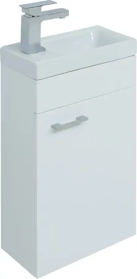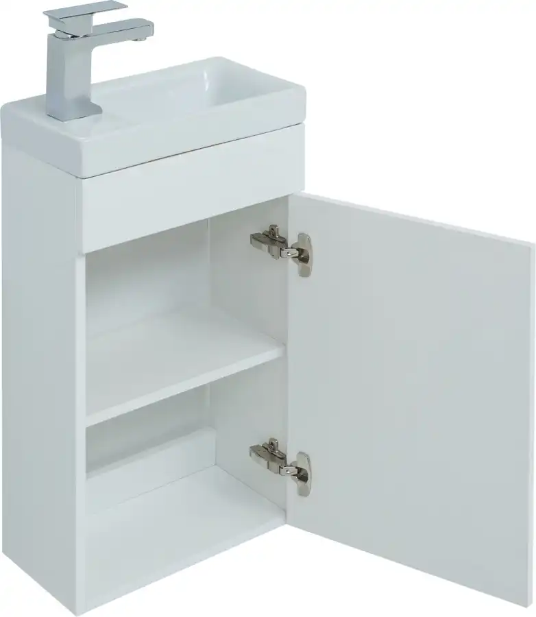 Тумба с раковиной Aquanet «Нота» 40 L (Moduo) — компактная модель белого цвета с левосторонней ориентацией, которая подойдет для обустройства небольшой ванной комнаты или санузла. Монтаж настенный, что облегчает уборку напольного покрытия. Корпус сделан из устойчивой к воздействию влаги ЛДСП, фасады — из МДФ. За распашной дверцей, дополненной серебристой ручкой, располагается одна полка для хранения. На тумбу устанавливают раковину Cersanit Moduo 40 S-UM-MOD40/1. Корпус изготовлен из белоснежного фарфора, не вызывающего сложностей при уходе. Материал экологичен и безопасен. Габариты — 400х220х155 мм. Для очищения поверхностей используют влажную ткань и средства бытовой химии, не содержащие абразивные частицы. Рекомендуем дополнить раковину хромированным смесителем от производителя Allen Brau из коллекции Infinity (артикул 5.21001-00).