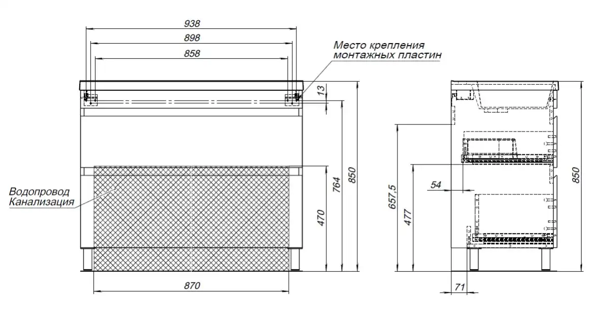 Место для подводки коммуникаций снизу за нижним ящиком, что упрощает монтаж и обслуживание.