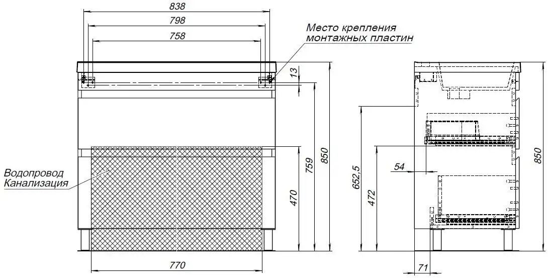 Место для подводки коммуникаций снизу за нижним ящиком, что упрощает монтаж и обслуживание.