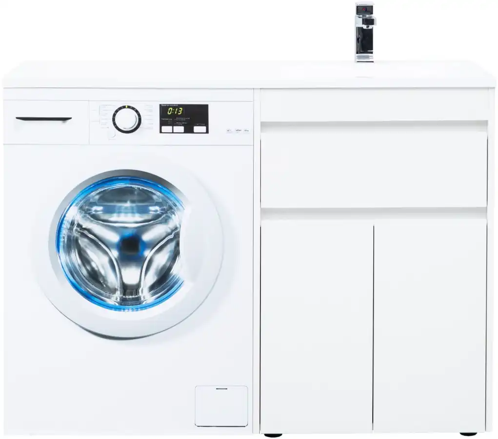 Тумба с раковиной Aquanet Токио 120 (напольная, 1 ящик, 2 дверцы) белого цвета представляет новый формат тумб производства Aquanet. Раковина из литьевого мрамора имеет длинную платформу, которая выходит далеко за пределы тумбы. Она предназначена для того, чтобы установить с левой стороны от тумбы стиральную машину. Платформа имеет такую длину, которая позволит спрятать под нее машинку средних размеров с фронтальной загрузкой. Корпус тумбы выполнен из влагостойкого ЛДСП, а фасады – из МДФ с покрытием эмалью. Разнообразные зоны хранения в тумбе шириной 580 мм скрыты в ящике и за распашными дверками. Тумбу можно использовать и без соседства со стиральной машиной, а свободное пространство под платформой раковины занять подкатной тумбой, приспособлениями для уборки помещения или столиком.