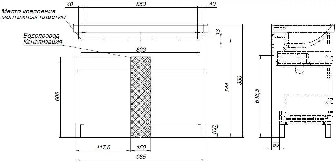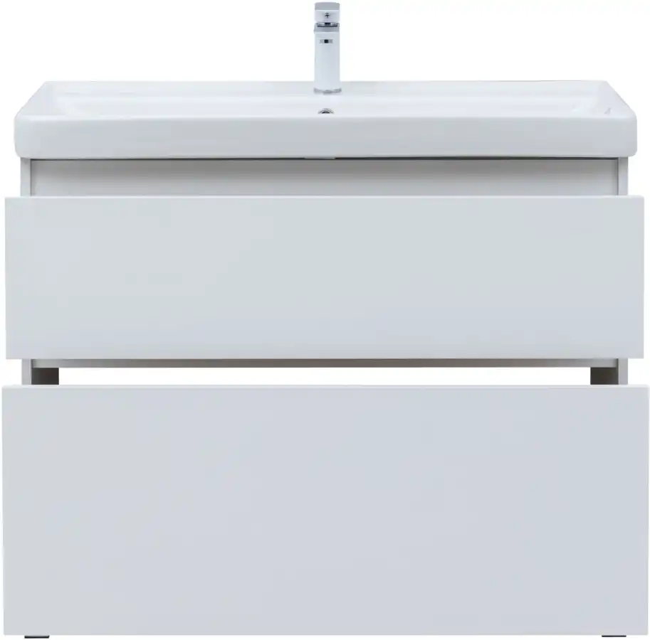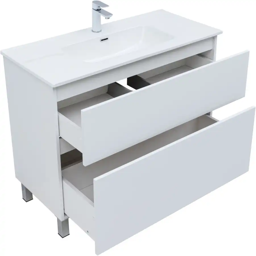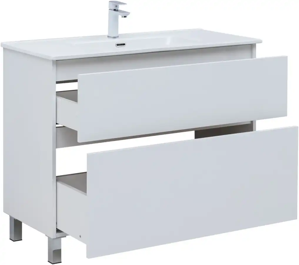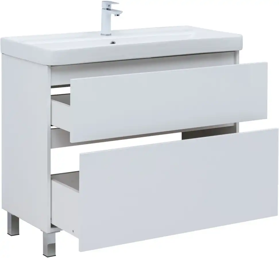 Пластиковое ограждение сифона в сером цвете аккуратно скрывает коммуникации. Прочное дно нижнего ящика, изготовленное из влагостойкой ЛДСП толщиной 16 мм, позволяет хранить даже тяжелые предметы. Предусмотренное место за нижним ящиком для подводки коммуникаций снизу упрощает монтаж и подключение сантехники. Aquanet Вега 100 – это оптимальное решение для создания стильного и практичного интерьера ванной комнаты.