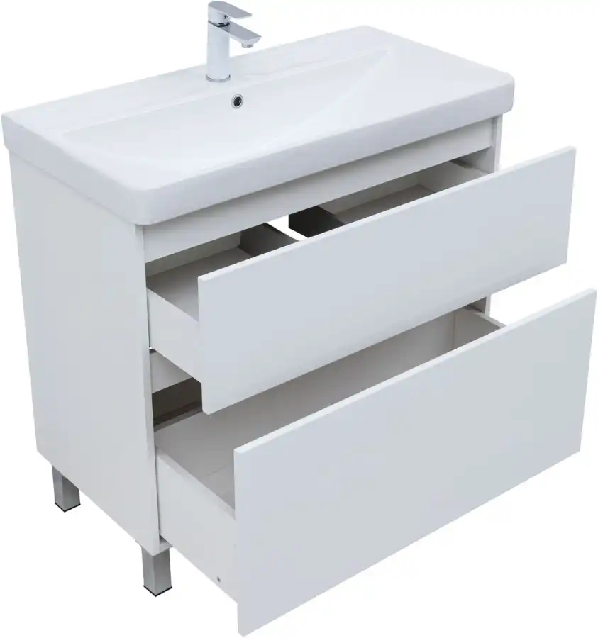 Пластиковое ограждение сифона в сером цвете аккуратно скрывает коммуникации. Прочное дно нижнего ящика, изготовленное из влагостойкой ЛДСП толщиной 16 мм, позволяет хранить даже тяжелые предметы. Предусмотренное место за нижним ящиком для подводки коммуникаций снизу упрощает монтаж и подключение сантехники. Aquanet Вега 90 – это оптимальное решение для создания стильного и практичного интерьера ванной комнаты.