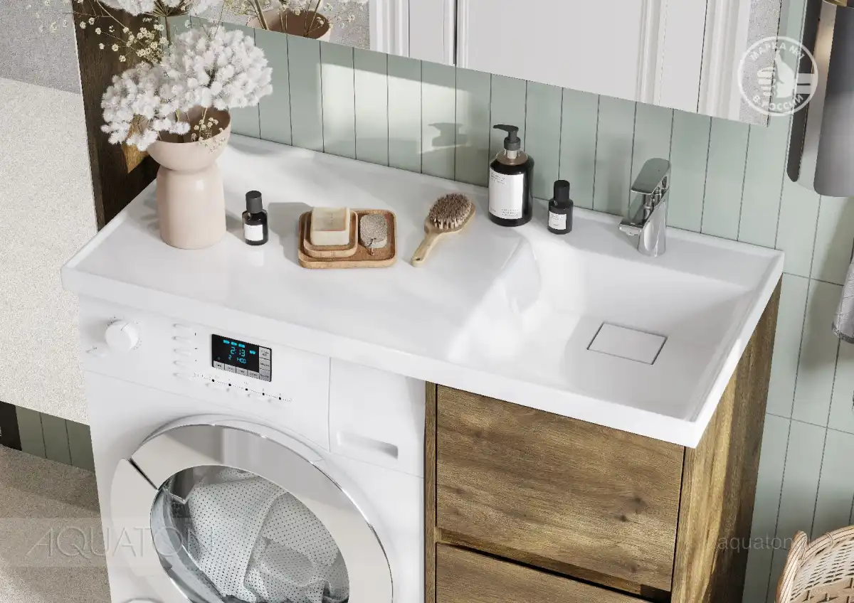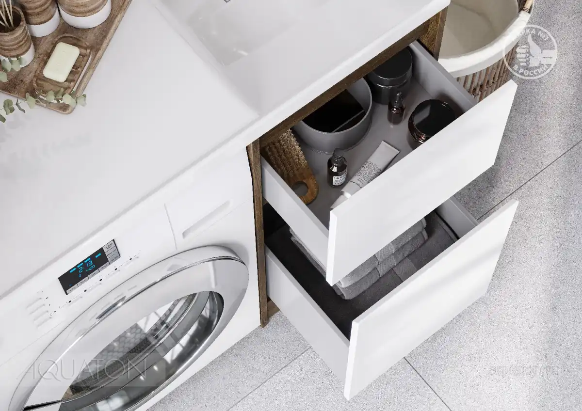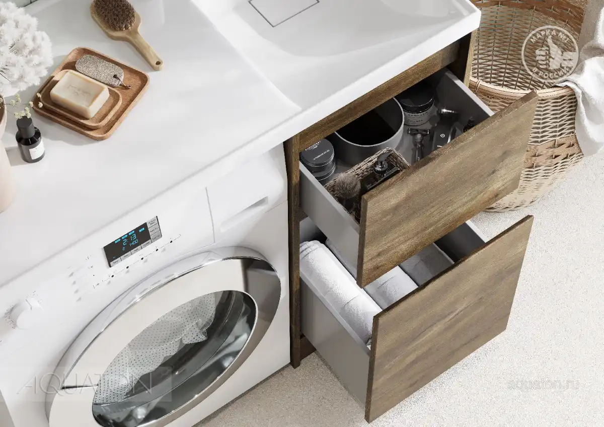 Тумба Лондри под стиральную машину выполнена из влагостойкой ламинированной плиты в древесной отделке. Фасад и раковина приобретаются отдельно. Тумбы комплектуются фасадами как с такой же древесной текстурой, так и в универсальном белом глянцевом цвете – это позволяет выбрать модель тумбы в соответствии с личными предпочтениями, создав наиболее удачное решение для конкретного интерьера ванной комнаты. Более того, при желании в одной тумбе можно совместить корпус и фасады в двух разных по оттенку древесных декорах. Верхний ящик открывается с помощью системы push-to-open, а нижний - за фасад с помощью удобного выпила под углом. Ящики выдерживают нагрузку до 25 кг. Тумба установлена на регулируемые опоры, которые находятся за цоколем. Тумба комплектуется раковиной Лондри 105 из прочного литого мрамора, который устойчив к воздействию химических средств. Широкое крыло раковины обеспечивает ванную комнату дополнительным функциональным пространством. Дополнительно к тумбе можно приобрести шкаф-колонну Лондри и зеркальный шкаф Лондри 100.