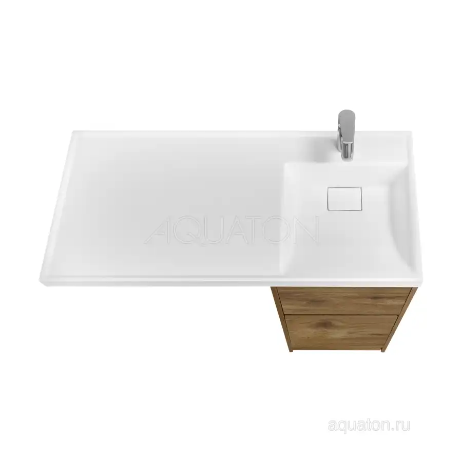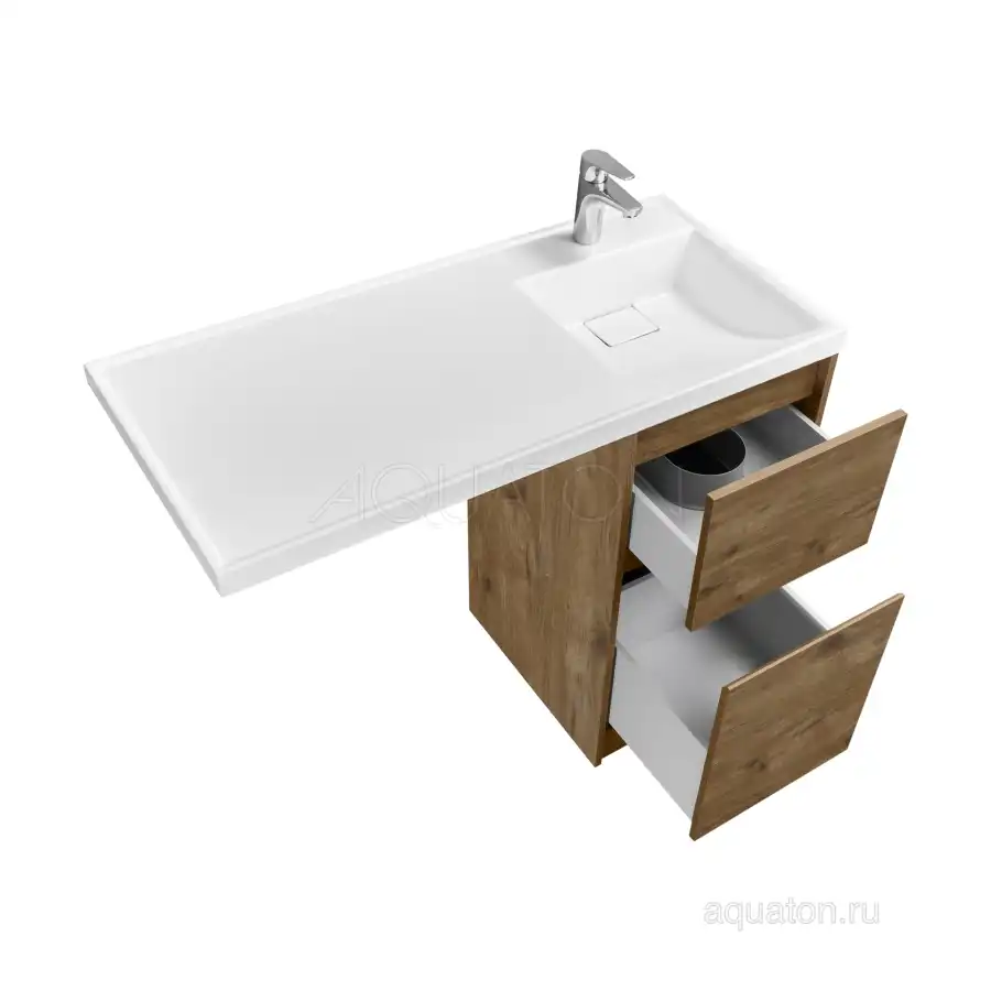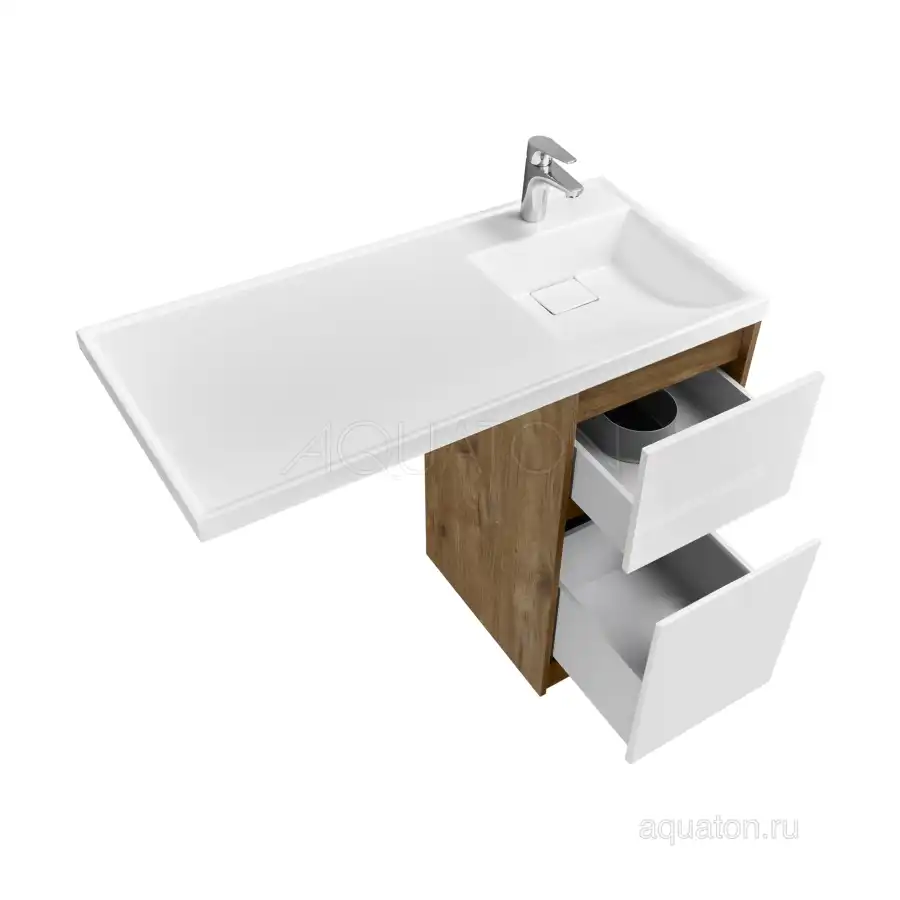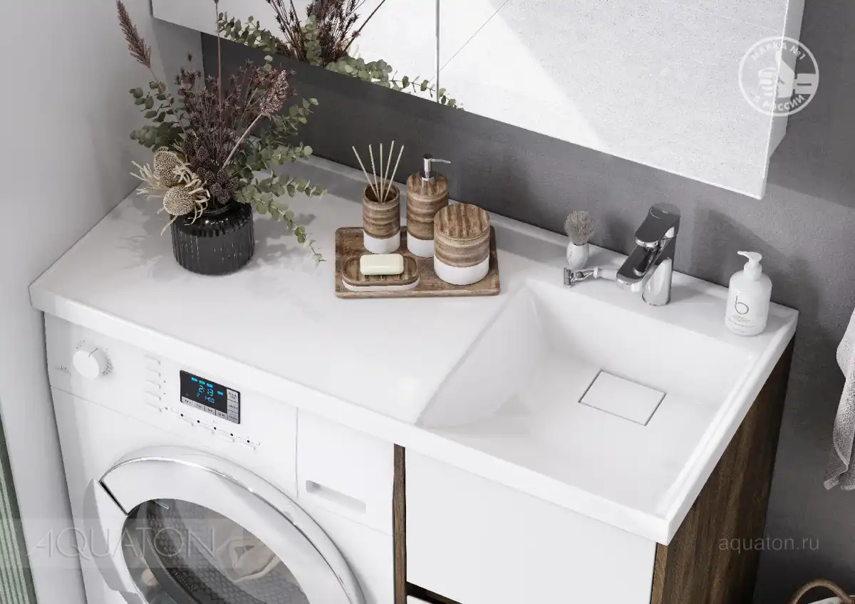 Тумба Лондри под стиральную машину выполнена из влагостойкой ламинированной плиты в древесной отделке. Фасад и раковина приобретаются отдельно. Тумбы комплектуются фасадами как с такой же древесной текстурой, так и в универсальном белом глянцевом цвете – это позволяет выбрать модель тумбы в соответствии с личными предпочтениями, создав наиболее удачное решение для конкретного интерьера ванной комнаты. Более того, при желании в одной тумбе можно совместить корпус и фасады в двух разных по оттенку древесных декорах. Верхний ящик открывается с помощью системы push-to-open, а нижний - за фасад с помощью удобного выпила под углом. Ящики выдерживают нагрузку до 25 кг. Тумба установлена на регулируемые опоры, которые находятся за цоколем. Тумба комплектуется раковиной Лондри 105 из прочного литого мрамора, который устойчив к воздействию химических средств. Широкое крыло раковины обеспечивает ванную комнату дополнительным функциональным пространством. Дополнительно к тумбе можно приобрести шкаф-колонну Лондри и зеркальный шкаф Лондри 100.