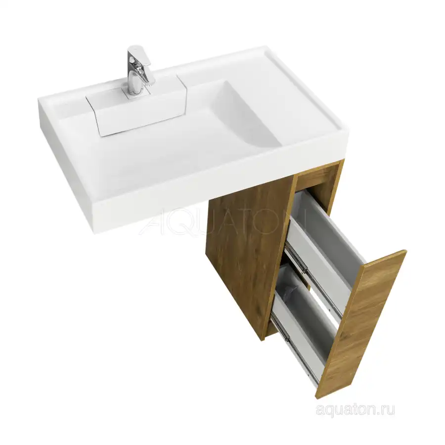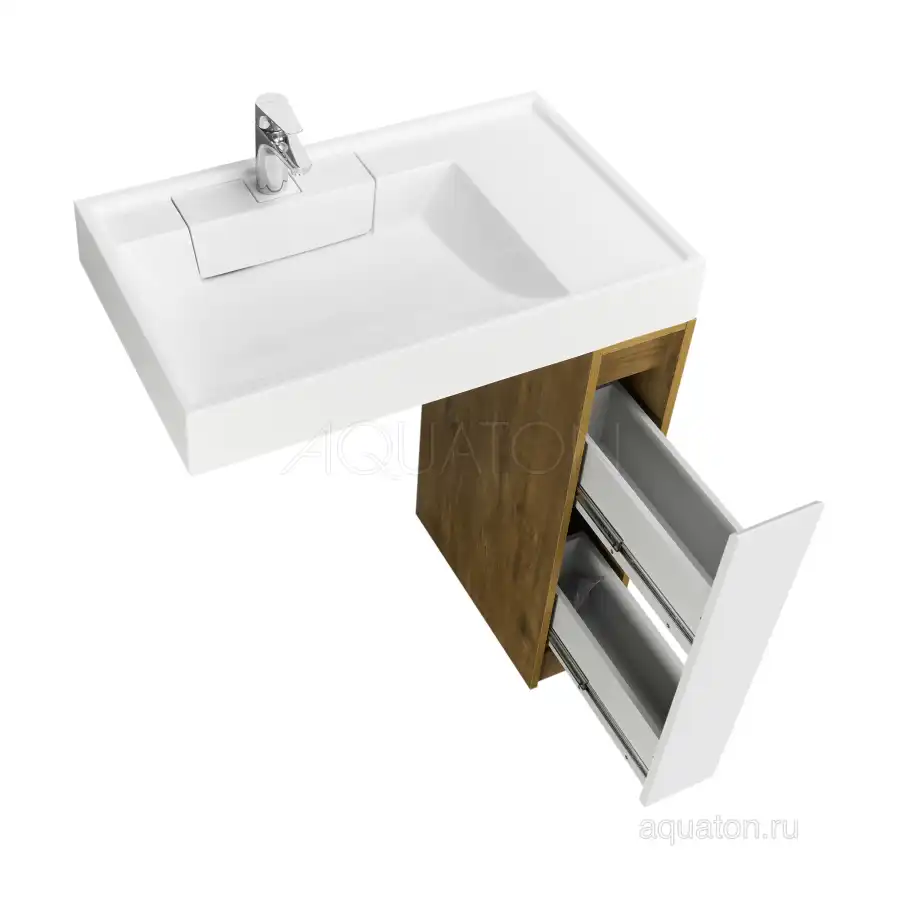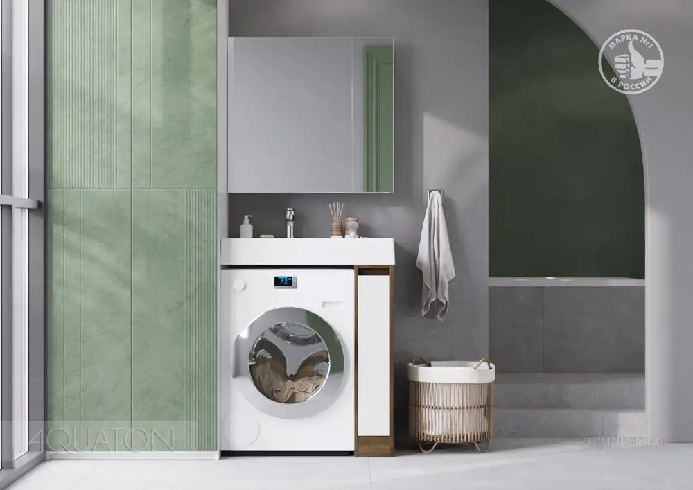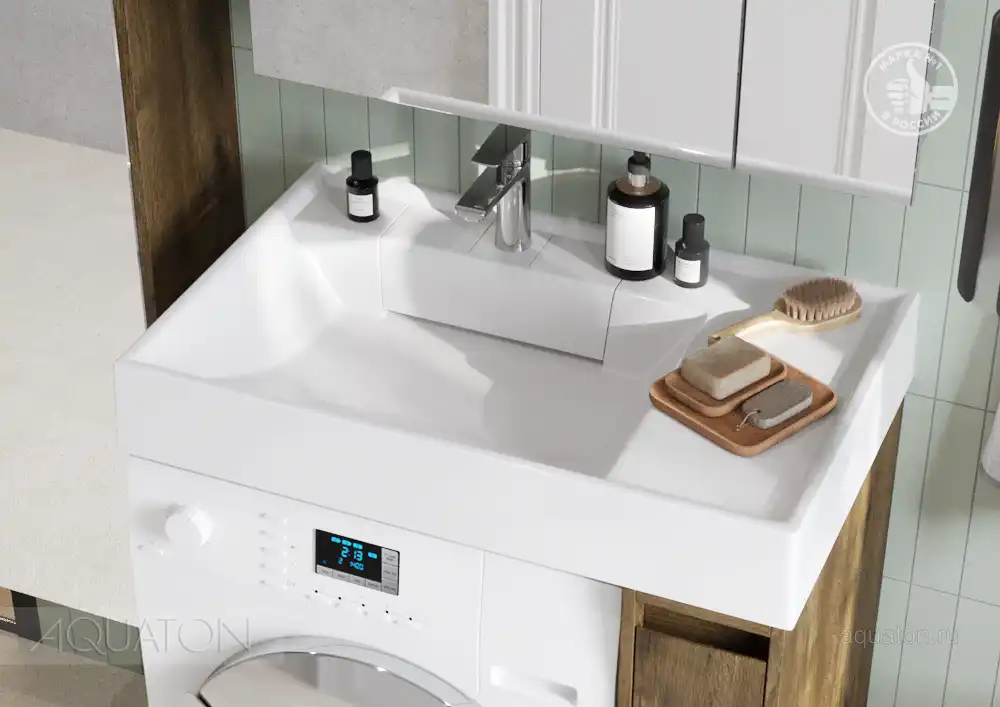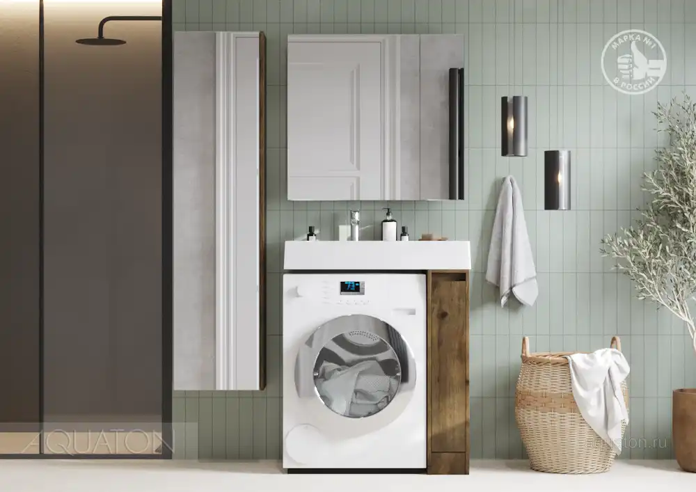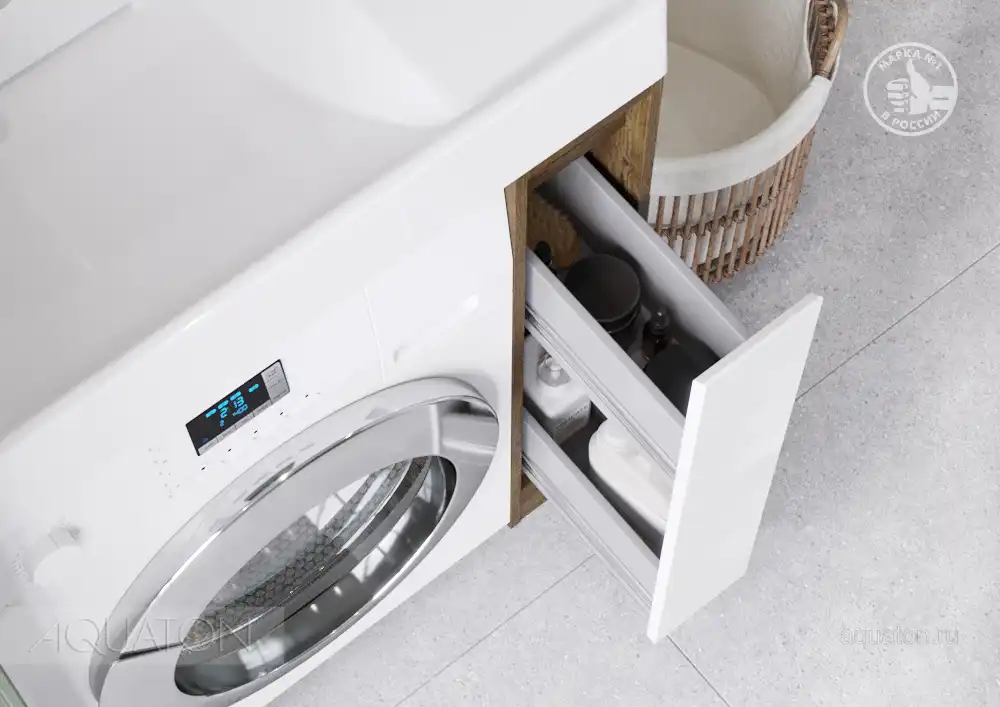 Тумба Лондри под стиральную машину выполнена из влагостойкой ламинированной плиты в древесной отделке. Фасад и раковина приобретаются отдельно. Тумбы комплектуются фасадами как с такой же древесной текстурой, так и в универсальном белом глянцевом цвете – это позволяет выбрать модель тумбы в соответствии с личными предпочтениями, создав наиболее удачное решение для конкретного интерьера ванной комнаты. Более того, при желании в одной тумбе можно совместить корпус и фасады в двух разных по оттенку древесных декорах. За фасадом тумбы скрывается удобная бутылочница. Открытие тумбы Лондри осуществляется за фасад благодаря эргономичному выпилу под углом. Ящик состоит из двух отделений: верхнего и нижнего. Каждое отделение ящика выдерживает нагрузку до 20 кг. Тумба комплектуется раковиной Рейн 80 из прочного литого мрамора. Компактный размер данного комплекта подойдет для небольших ванных комнат и обеспечит место для хранения необходимых предметов и аксессуаров. Дополнительно к тумбе можно приобрести шкаф-колонну Лондри и зеркальный шкаф Лондри 80.