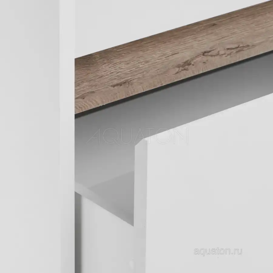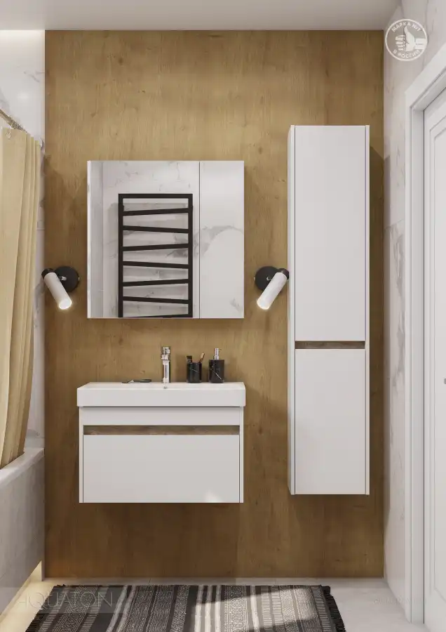 Тумба МАРТИ 70 отличается вместительностью и удобством в использовании: при желании в ящике можно организовать хранение не только шампуней и кремов, но и, например, полотенец. При этом тумба МАРТИ смотрится интересно благодаря выпилу на фасаде, который позволяет открывать тумбу за фасад: в углублении видна контрастная вставка в древесной отделке. Эта акцентная деталь придает модели графичность и позволяет подчеркнуть правильные пропорции тумбы. Корпус и боковые стенки изготовлены из влагостойкой ламинированной ДСП, окрашенной в белый цвет специальной краской ультрафиолетового отверждения для защиты мебели от влаги в условиях ванной комнаты. Декоративная вставка в цвете дуб эндгрейн.