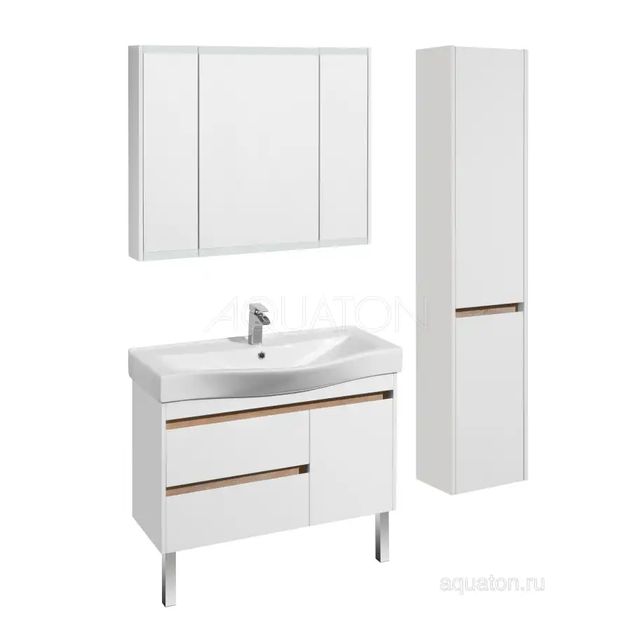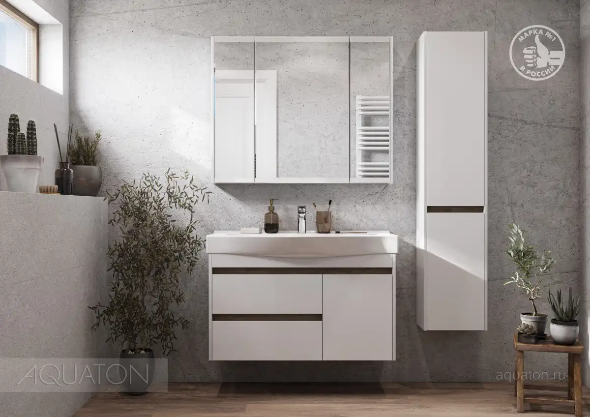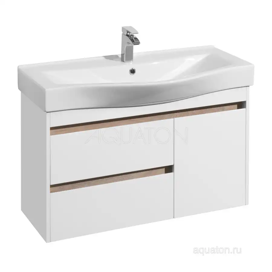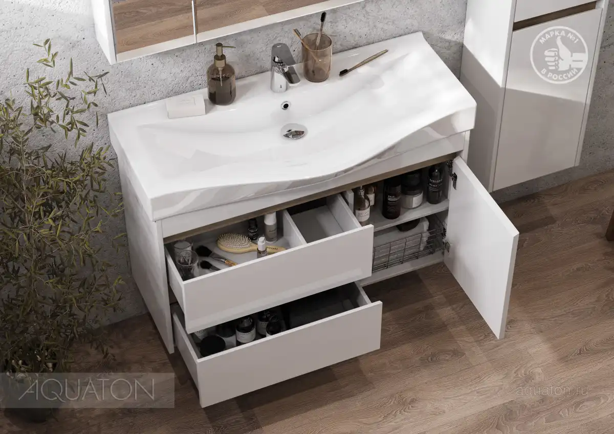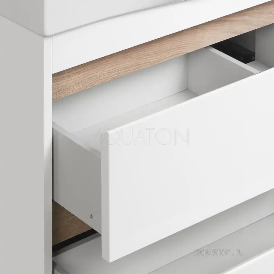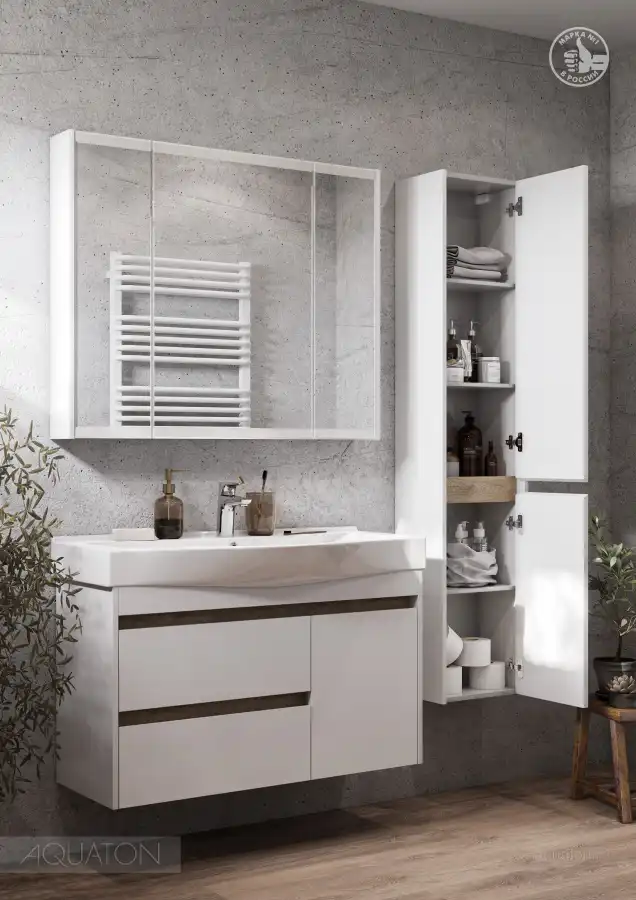 Тумба Нортон 100 в лаконичном дизайне универсальна для любого интерьера ванной комнаты. Корпус тумбы выполнен из влагостойкой ЛДСП, а фасады из МДФ в белой глянцевой покраске. Дизайн тумбы подчеркивает декоративная вставка из ЛДСП с фактурой натурального дерева дуб эндгрейн. Конструктивно тумба состоит из 2 вместительных ящиков, установленных на направляющие с доводчиками для комфортного использования и фасада-створки, за которым находится ниша с регулируемой полочкой. На тумбе нет выступающих деталей и фурнитуры, открытие ящиков реализовано за счет удобного выреза на фасаде. Тумба комплектуется белоснежной раковиной Беверли от бренда Santek. Тумбу можно использовать в двух вариантах: подвесную или дополнительно приобрести опоры 1A222703SI000.