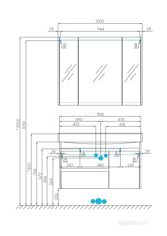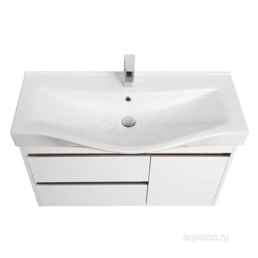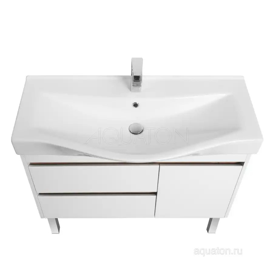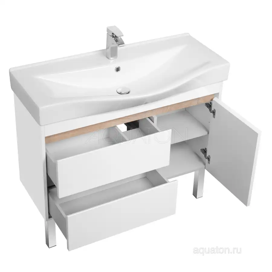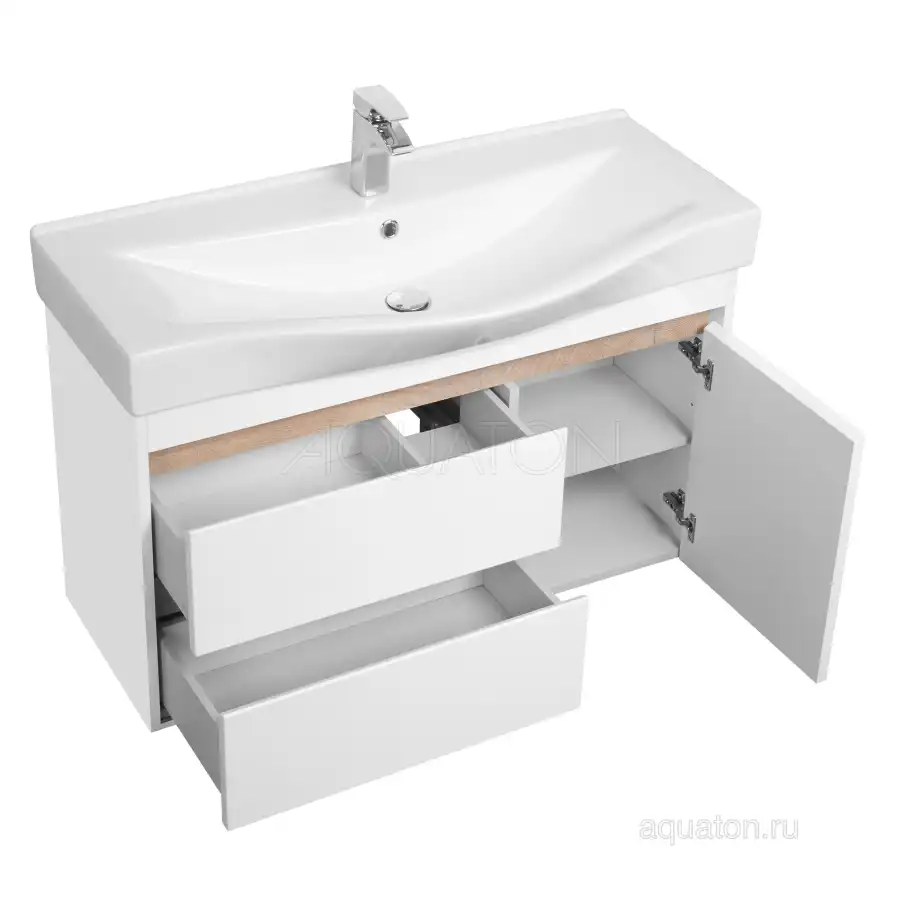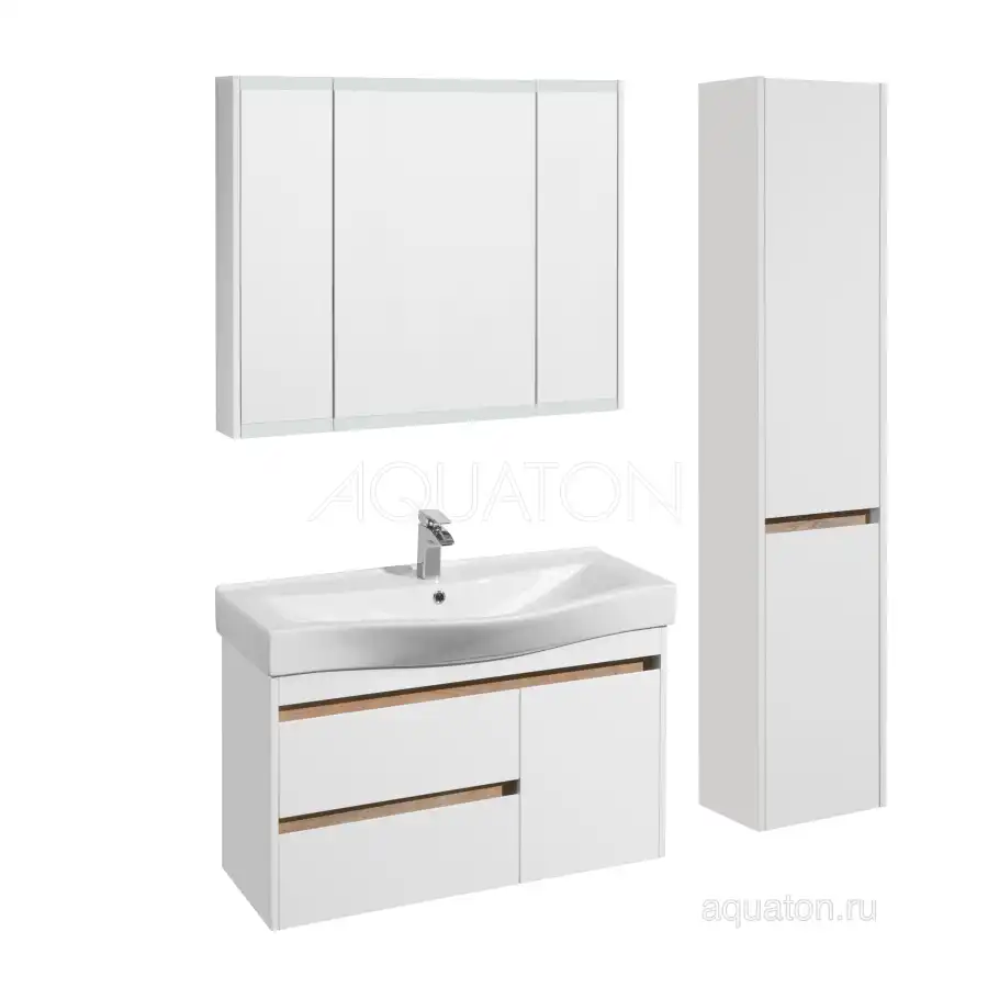 Тумба Нортон 100 в лаконичном дизайне универсальна для любого интерьера ванной комнаты. Корпус тумбы выполнен из влагостойкой ЛДСП, а фасады из МДФ в белой глянцевой покраске. Дизайн тумбы подчеркивает декоративная вставка из ЛДСП с фактурой натурального дерева дуб эндгрейн. Конструктивно тумба состоит из 2 вместительных ящиков, установленных на направляющие с доводчиками для комфортного использования и фасада-створки, за которым находится ниша с регулируемой полочкой. На тумбе нет выступающих деталей и фурнитуры, открытие ящиков реализовано за счет удобного выреза на фасаде. Тумба комплектуется белоснежной раковиной Беверли от бренда Santek. Тумбу можно использовать в двух вариантах: подвесную или дополнительно приобрести опоры 1A222703SI000.