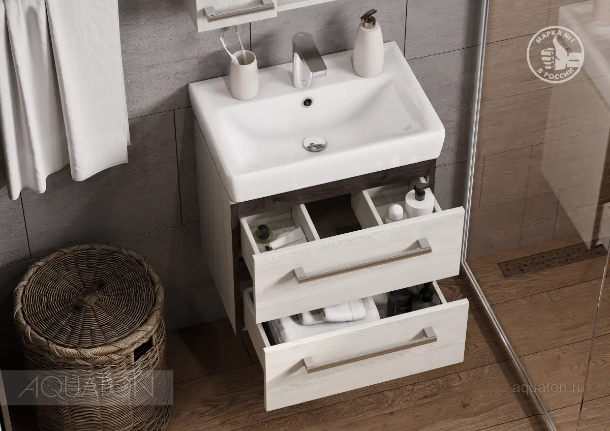 Подвесная тумба Ронда PRO 55 от AQUATON отличается сдержанным и лаконичным дизайном в духе минимализма. В приоритете - простые формы и функциональность. Весь корпус изготовлен из ламинированной, текстурированной влагостойкой ЛДСП в цвете дуб сомерсет. Конструкция верхнего ящика разделена на две секции, что очень удобно для хранения мелких предметов. Вместительны нижний ящик позволит спрятать более крупные вещи. Оба ящика установлены на надежные направляющие скрытого монтажа с доводчиками, которые обеспечивают его плавное и надежное закрывание. Тумбу украшают удобные ручки-рейлинги.