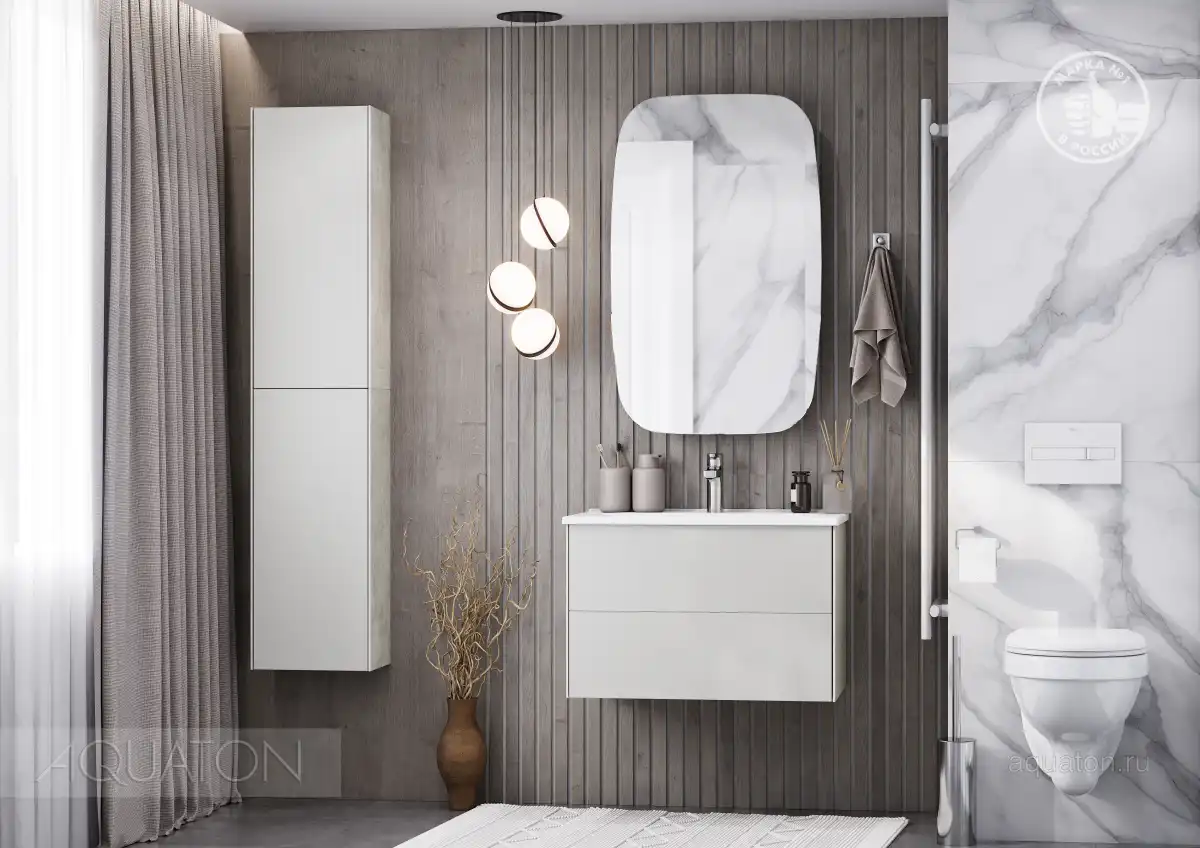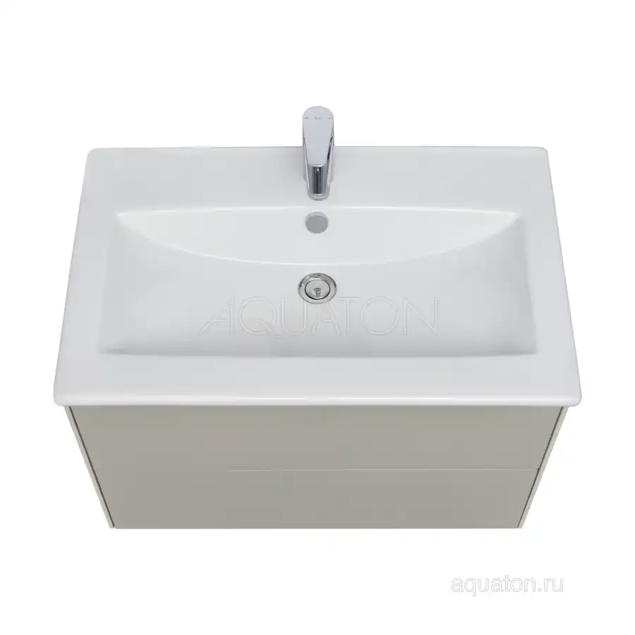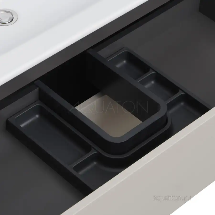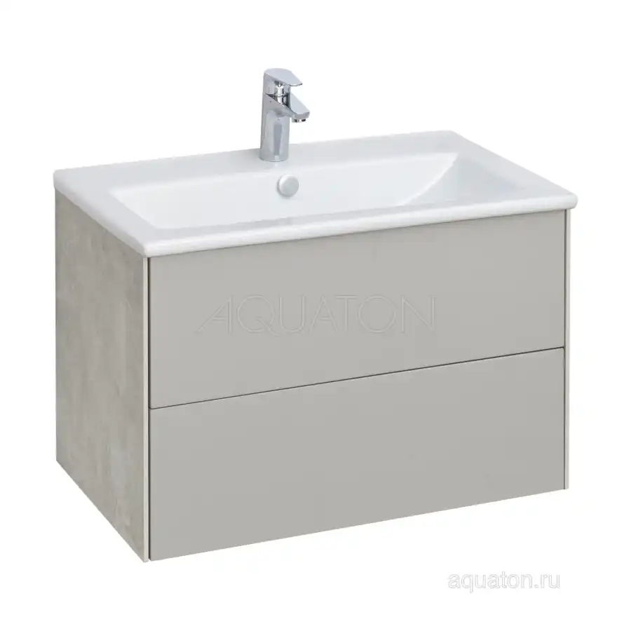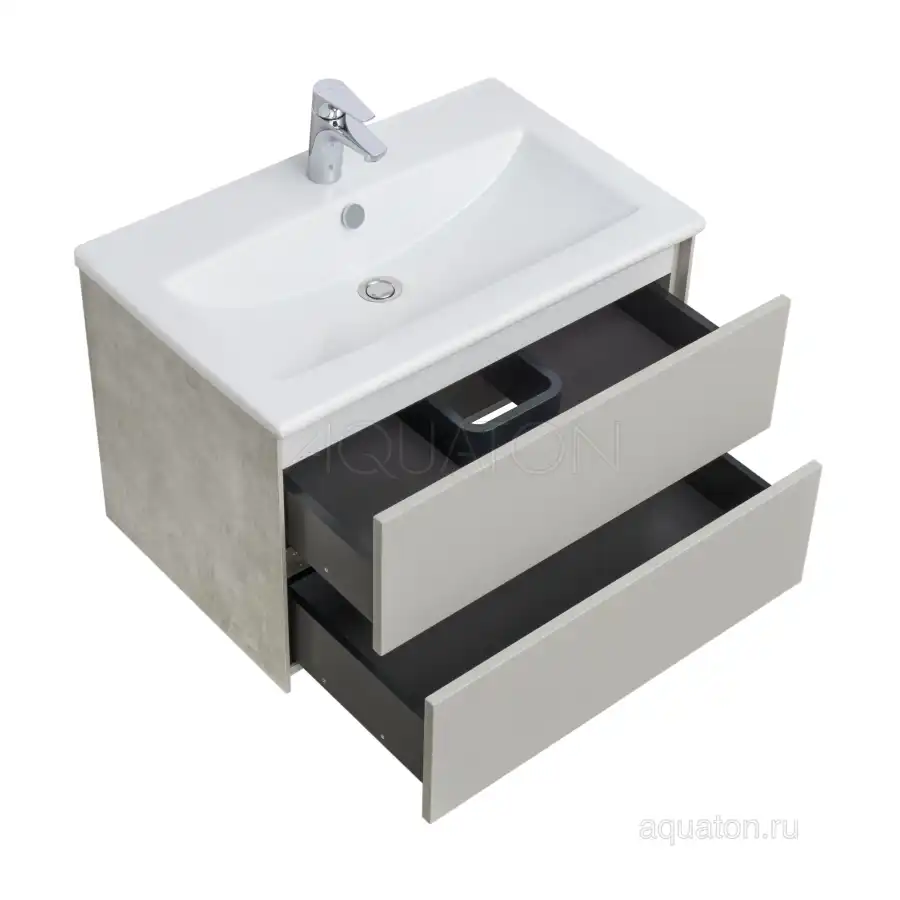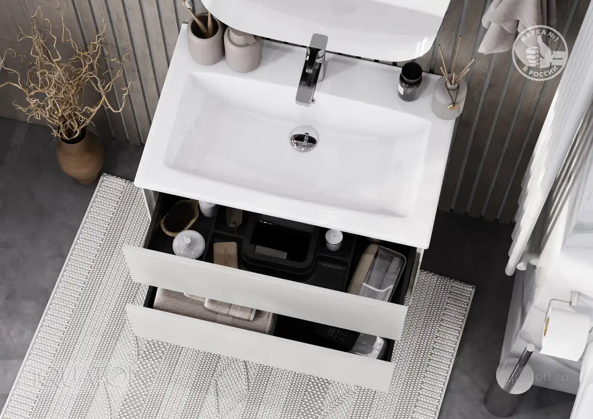 Тумба Сохо 75 функционально состоит из двух вместительных ящиков, оснащенных системой push to open, обеспечивающей надежное, комфортное и бесшумное закрывание. Фасады изделия выполнены из МДФ в пленке в цвете галька серая, корпус из ламинированной влагостойкой ДСП слэйт. Верхний и нижний ящики оснащены системой организации пространства, которая позволяет содержать косметические средства в идеальном порядке. Дополняет тумбу стильная раковина Элина от бренда Santek с удобной чашей. Все внутренние детали тумбы выполнены в цвете антрацит.