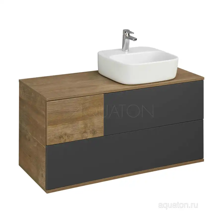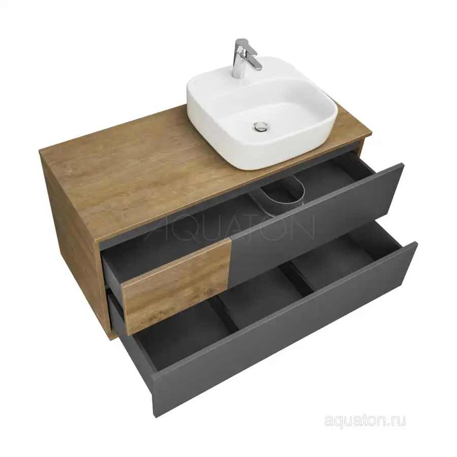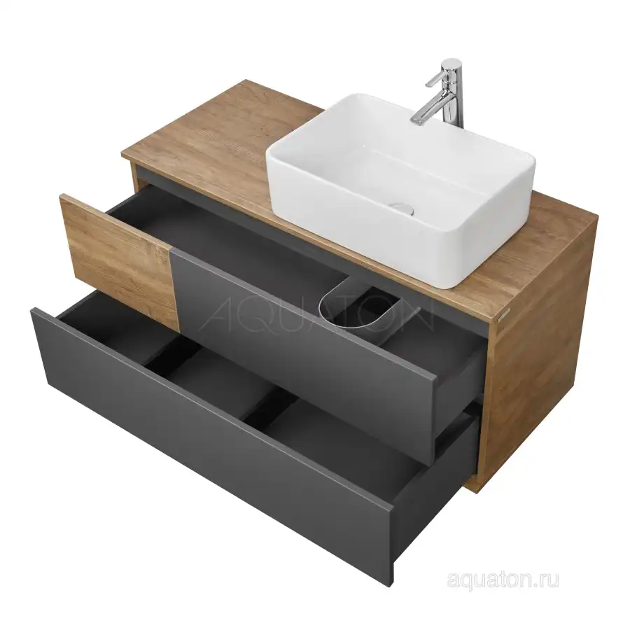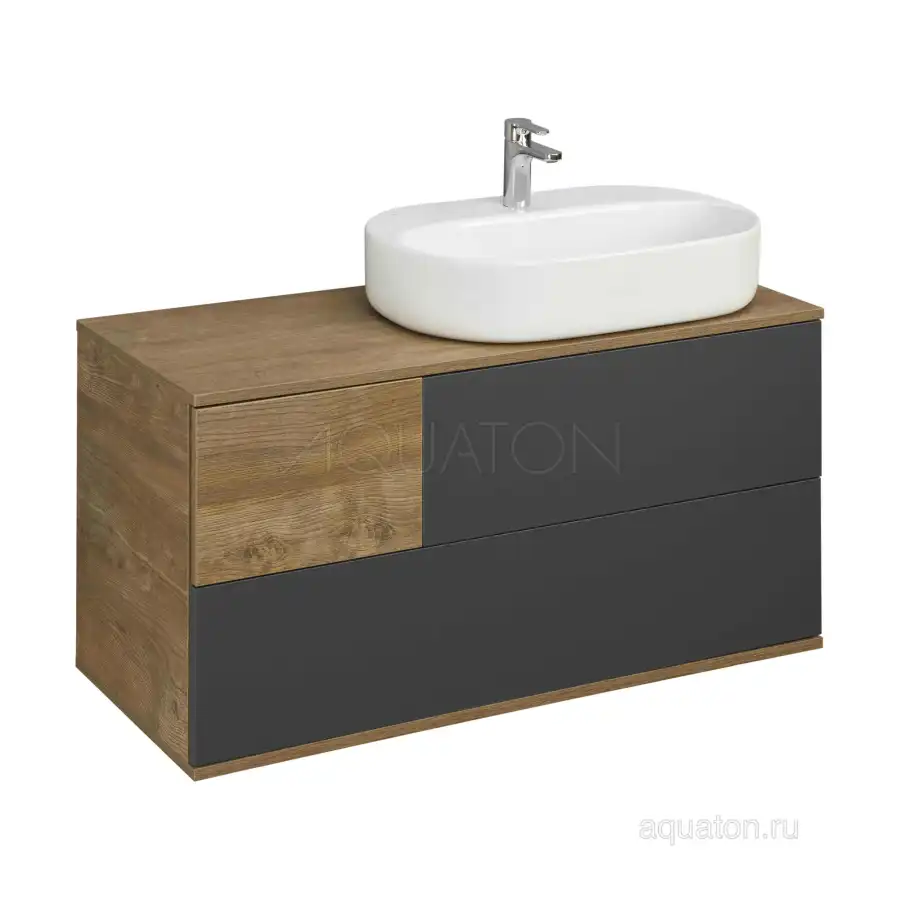 Коллекция Терра сочетает стильные оттенки: дуб кантри и антрацит. Текстуры на тумбе Терра 105 расположены ассиметрично: столешница, корпус и вставка на верхнем ящике - влагостойкое ДСП с текстурой дуб кантри, фасады ящиков - матовая серая пленка антрацит. Тумба умывальник состоит из двух вместительных ящиков, открывающихся с помощью системы push-to-open, нижний ящик комплектуется системой организации пространства, которая препятствует смещению мелких косметических и гигиенических средств.