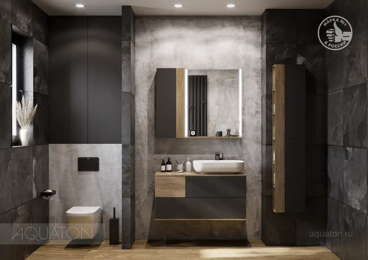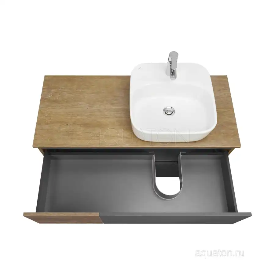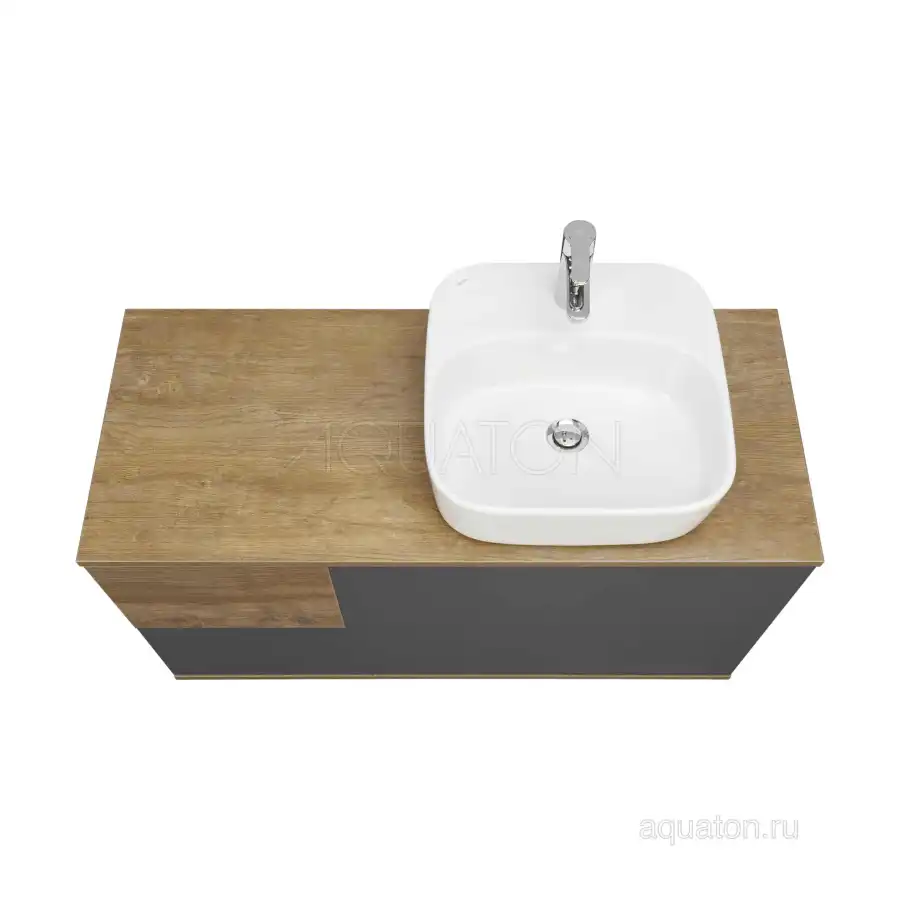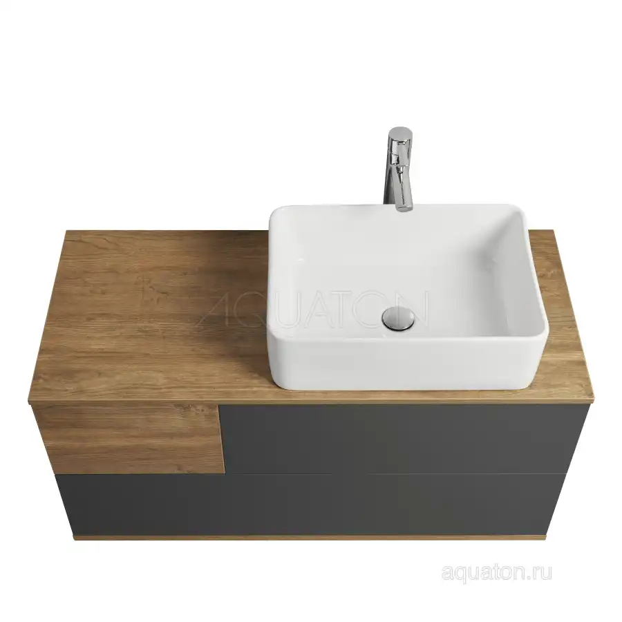 Коллекция Терра сочетает стильные оттенки: дуб кантри и антрацит. Текстуры на тумбе Терра 105 расположены ассиметрично: столешница, корпус и вставка на верхнем ящике - влагостойкое ДСП с текстурой дуб кантри, фасады ящиков - матовая серая пленка антрацит. Тумба умывальник состоит из двух вместительных ящиков, открывающихся с помощью системы push-to-open, нижний ящик комплектуется системой организации пространства, которая препятствует смещению мелких косметических и гигиенических средств.