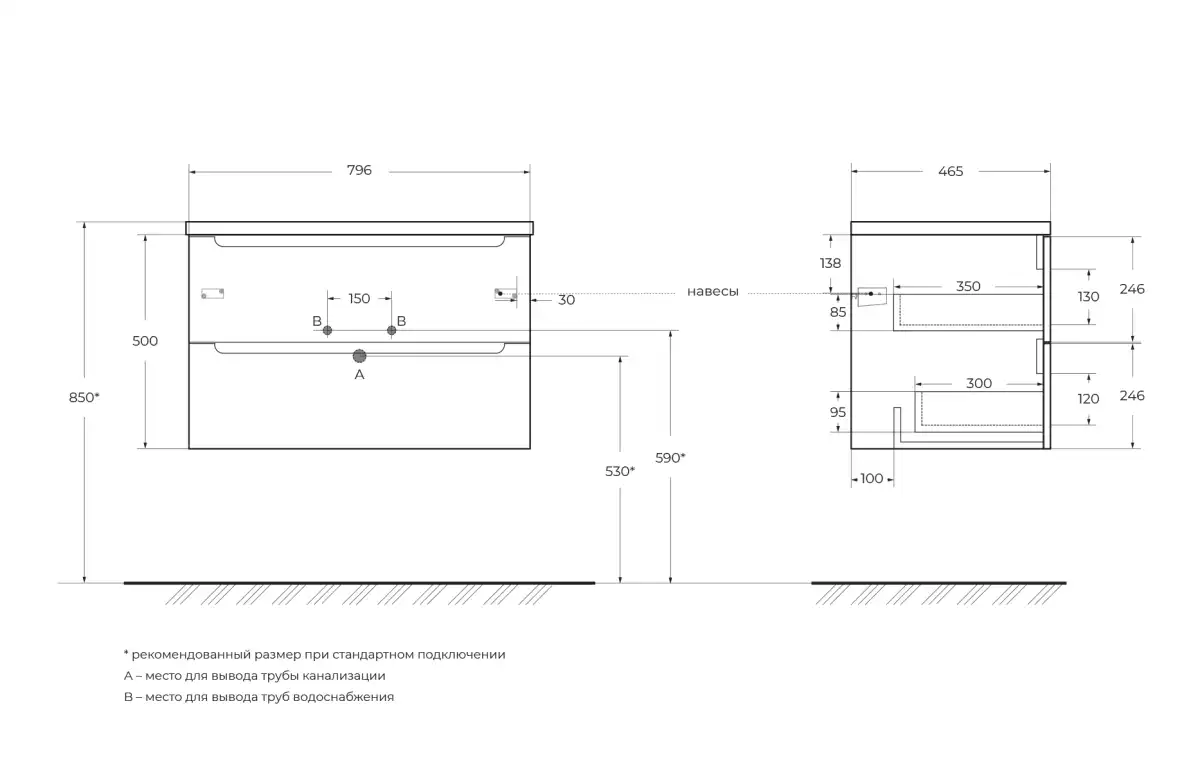 Дополнительная информация: база оснащена доводчиками, ручки скрыты в плоскости фасада, раковина сифоном не комплектуется
