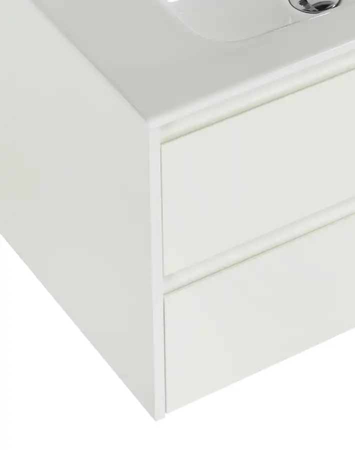 Дополнительная информация: база оснащена доводчиками скрытого монтажа с системой Soft close (плавного закрывания) С фрезерованными ручками по всей длине фасада; раковина сифоном не комплектуется