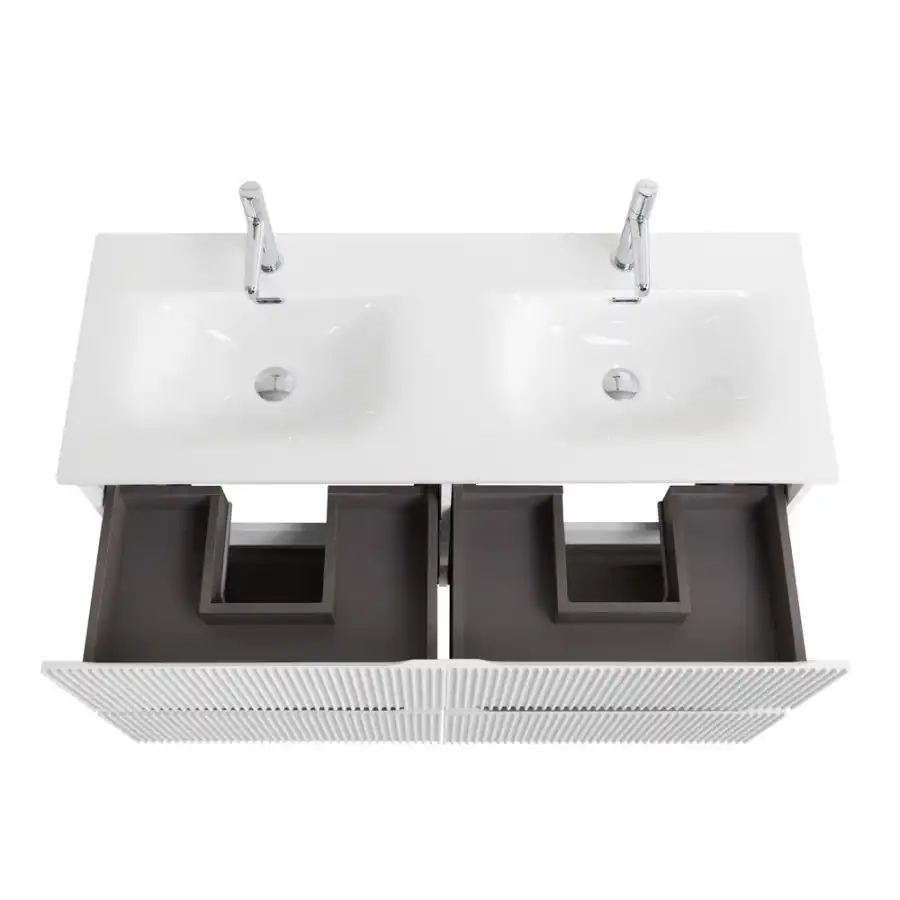 UNO – подвесные тумбы глубиной 455 мм и шириной от 600 до 1200 мм., с одним, двумя или четырьмя выкатными ящиками (1200 мм). Тумбы комплектуются керамическими раковинами с одной или двумя чашами (1200 мм).