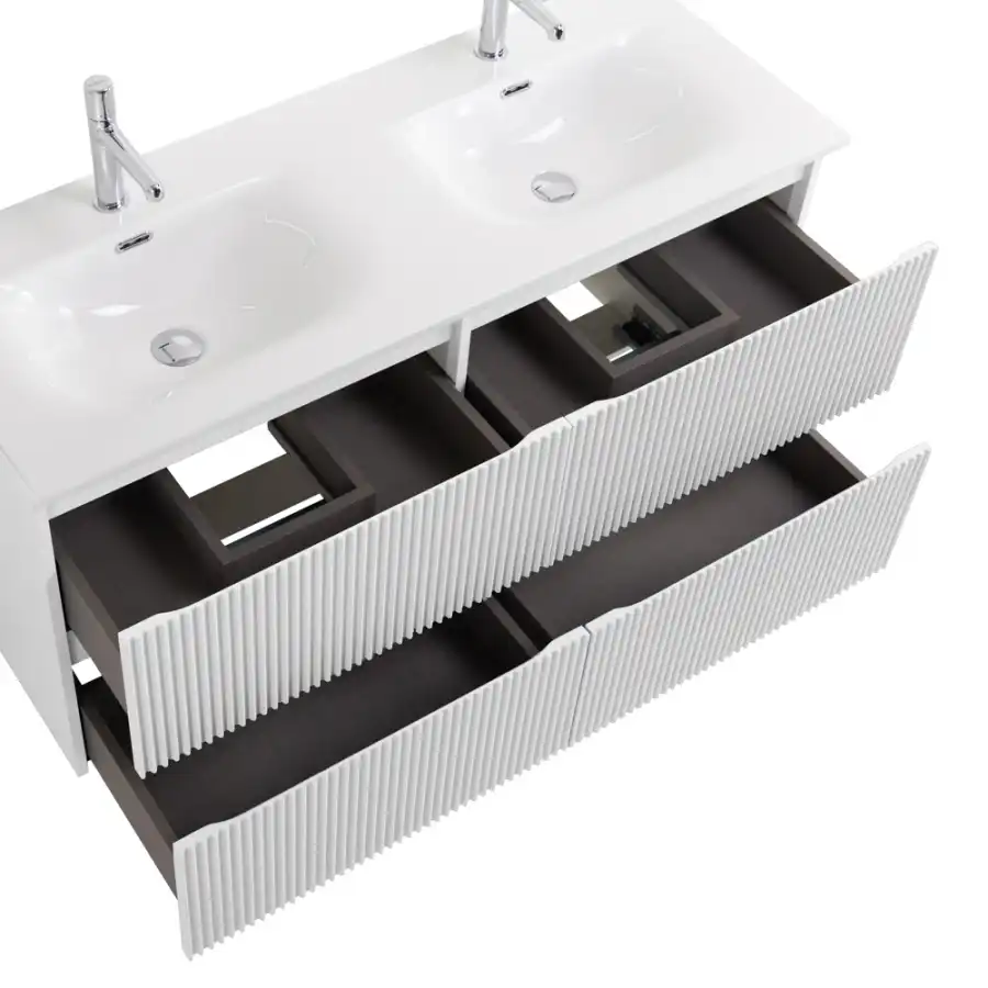 Главная изюминка коллекции – стильные плиссированные фасады, обогащающие интерьер текстурой, динамикой и сдержанной элегантностью, при этом легко сочетающиеся с разными материалами и стилями.