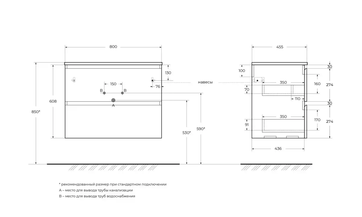 UNO – подвесные тумбы глубиной 455 мм и шириной от 600 до 1200 мм., с одним, двумя или четырьмя выкатными ящиками (1200 мм). Тумбы комплектуются керамическими раковинами с одной или двумя чашами (1200 мм).
