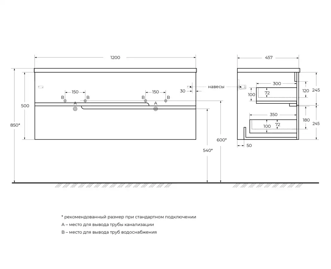 Тумба под раковину Cezares DUET-N 120 см, DUET-N-1200-2C-SO-2-BL подвесная, Bianco Lucido