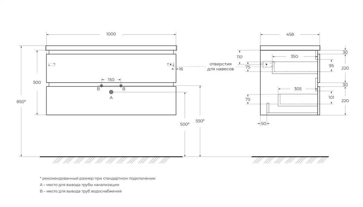 PLANE База под раковину подвесная с двумя выкатными ящиками, Белый глянец, 1000x458x500, PLANE-1000-2C-SO-BL