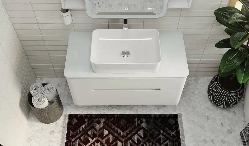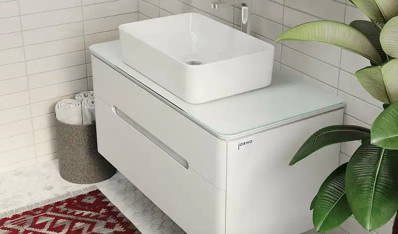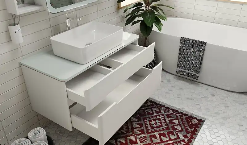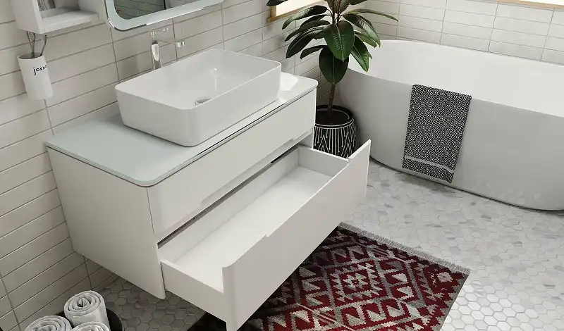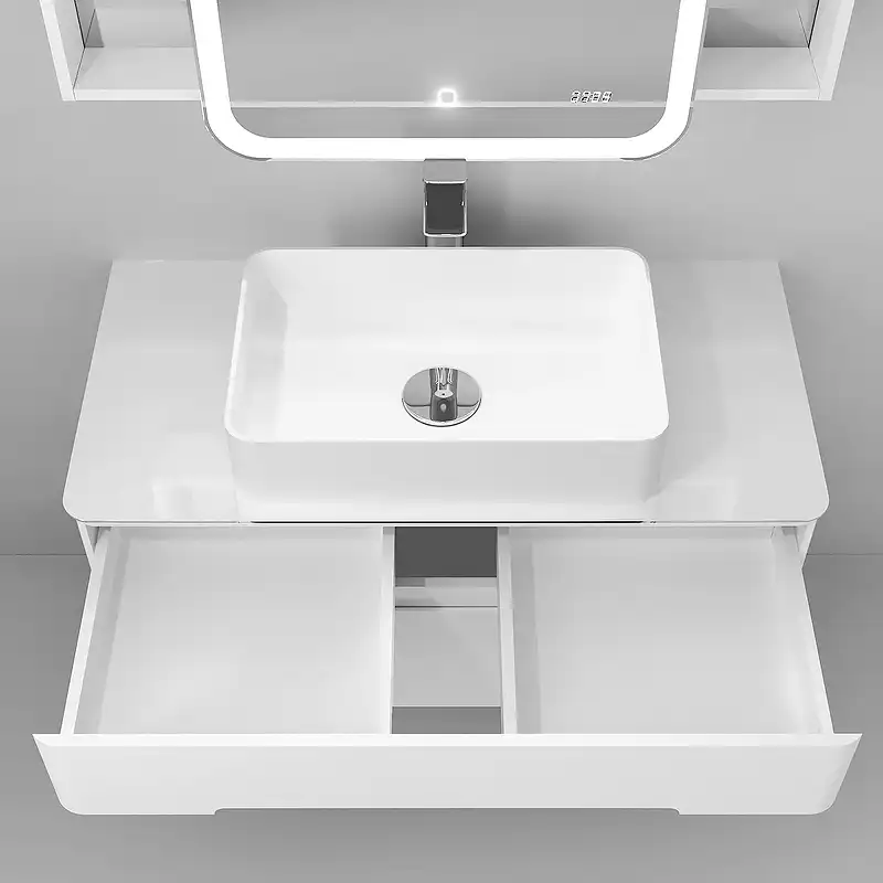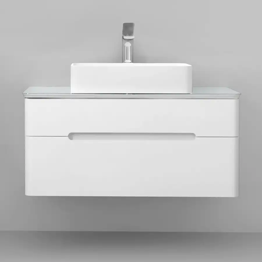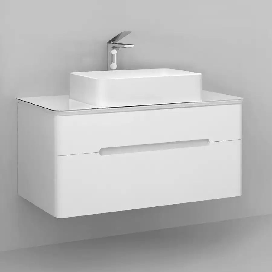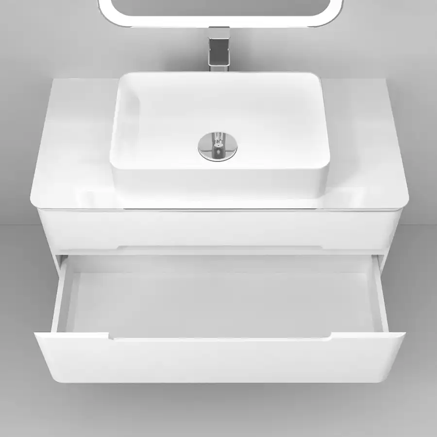 Тумба выполнена из МДФ в белой глянцевой пленке ПВХ, а столешница из стекла Lacobel. У тумбы 2 вместительных ящика с удобными интегрированными ручками и механизмом плавного закрывания.