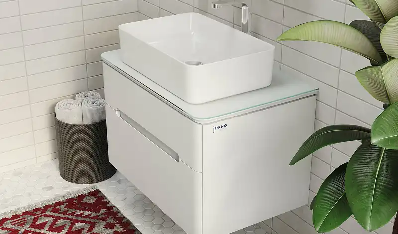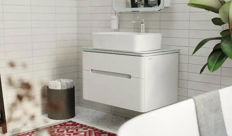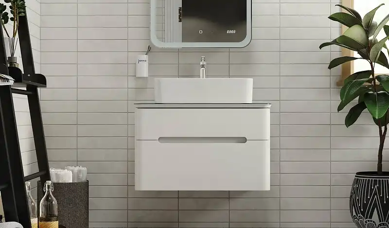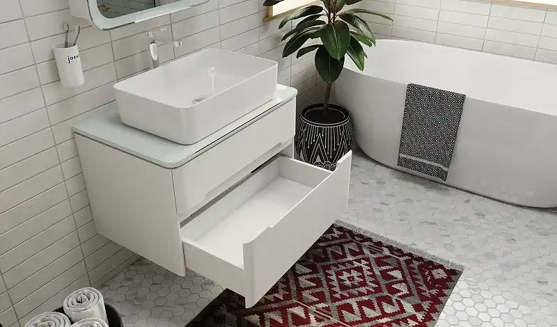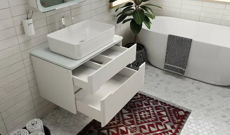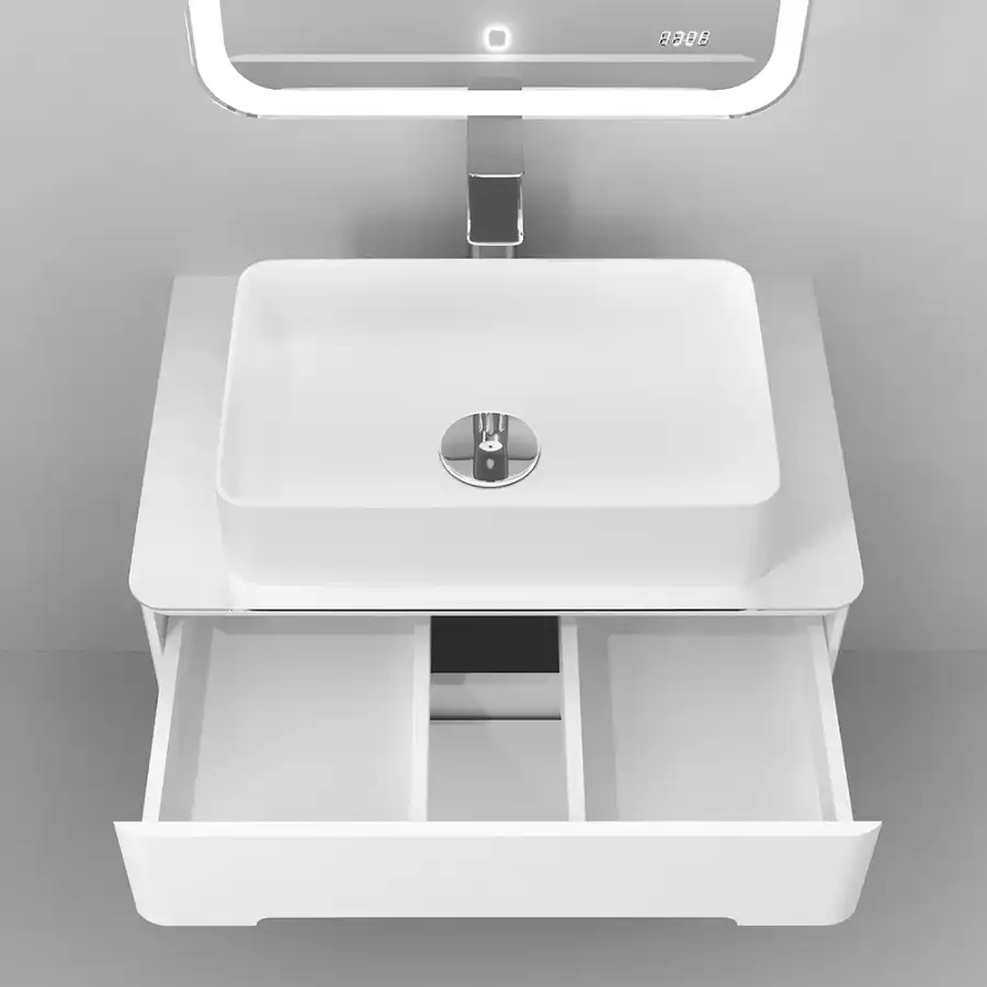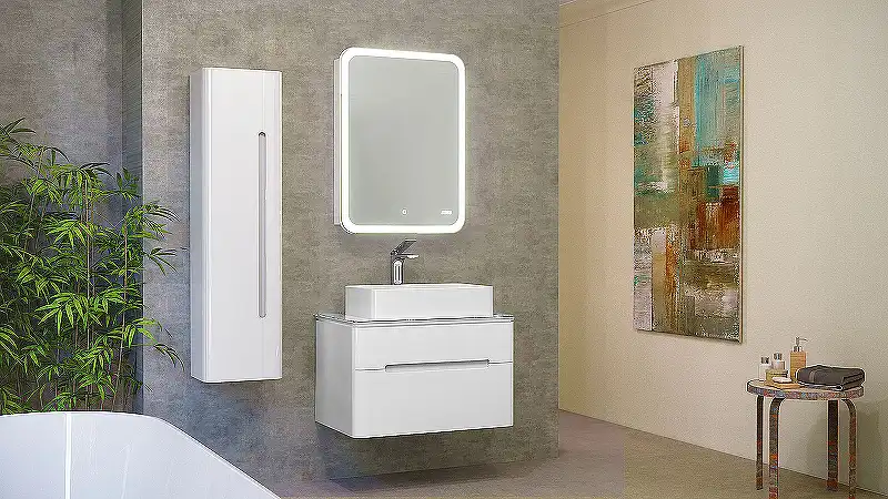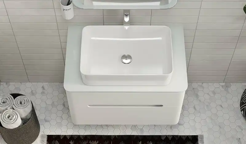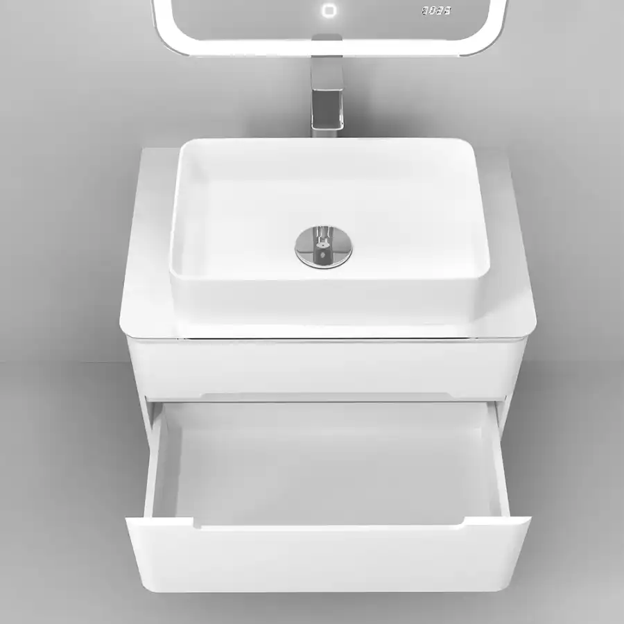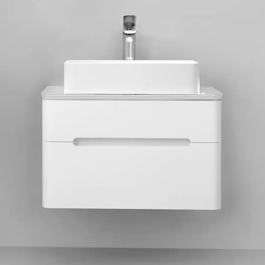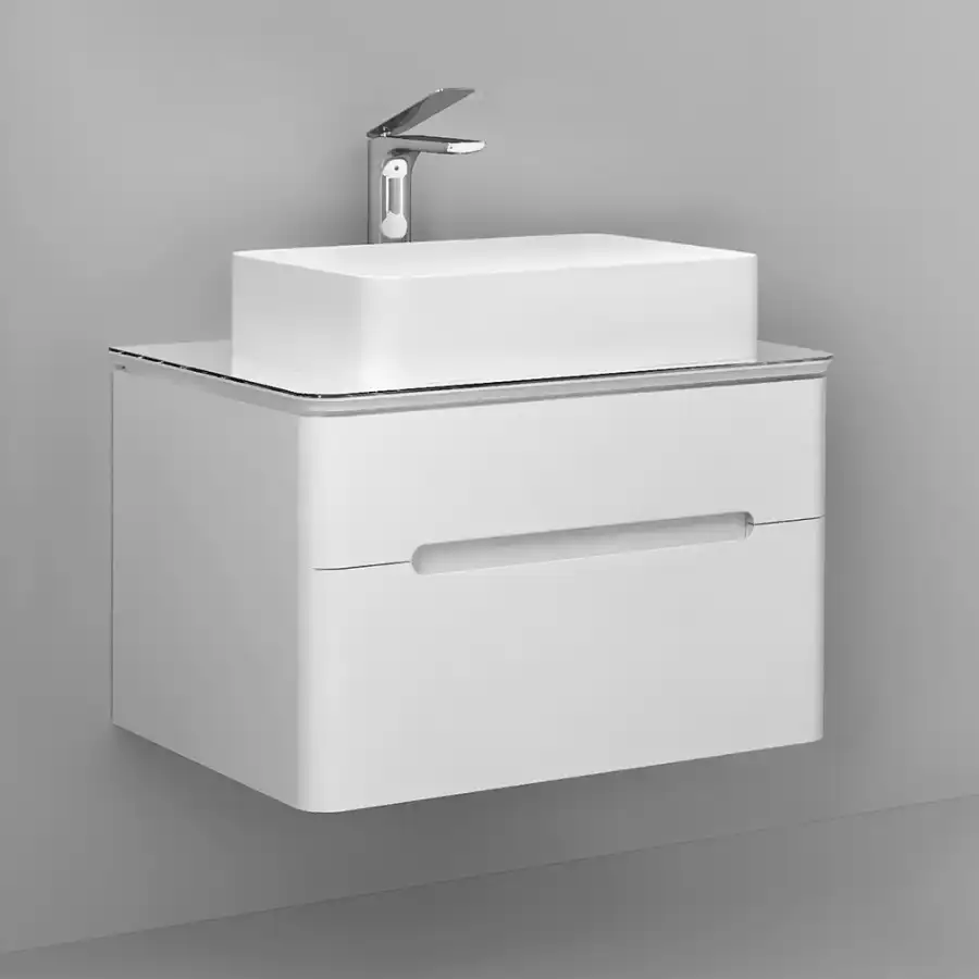 Тумба выполнена из МДФ в белой глянцевой пленке ПВХ, а столешница из стекла Lacobel. У тумбы 2 вместительных ящика с удобными интегрированными ручками и механизмом плавного закрывания.