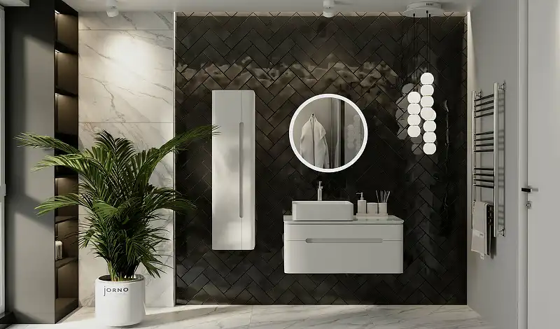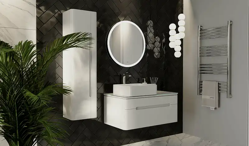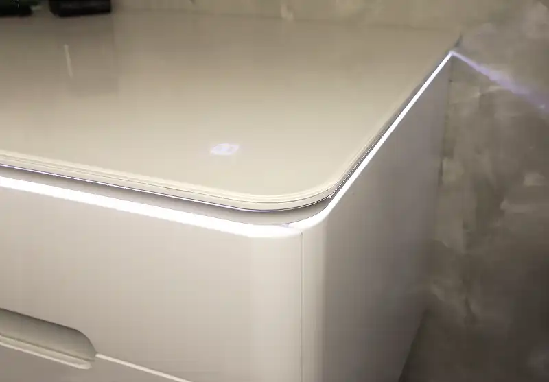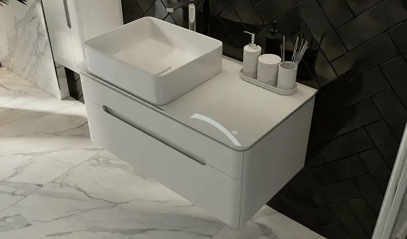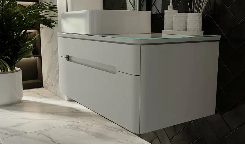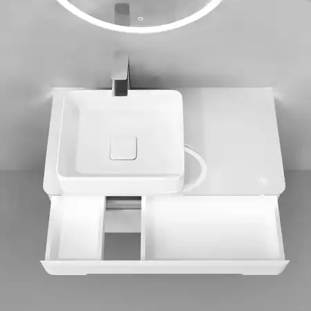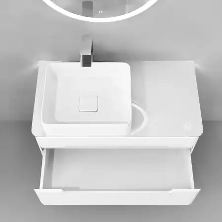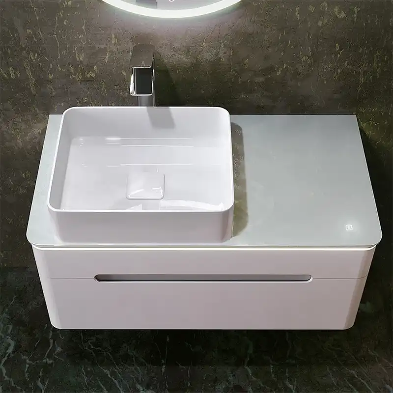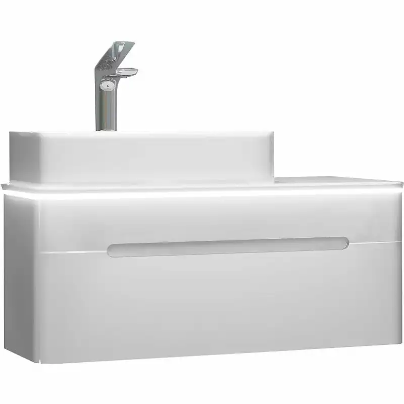 Тумба выполнена полностью из МДФ в белой глянцевой пленке ПВХ, а столешница из стекла Lacobel. Особенностью данной тумбы является подсветка столешницы с сенсорным включателем, которую можно регулировать по степени яркости. У тумбы 2 вместительных ящика с удобными интегрированными ручками и механизмом плавного закрывания.