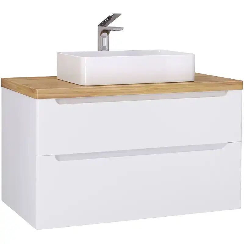 Подвесная тумба выполнена из МДФ в белой глянцевой пленке ПВХ. 2 вместительных выдвижных ящика оснащены удобными интегрированными ручками. Тумбу можно комплектовать разными по цвету столешницами: темное и светлое дерево.