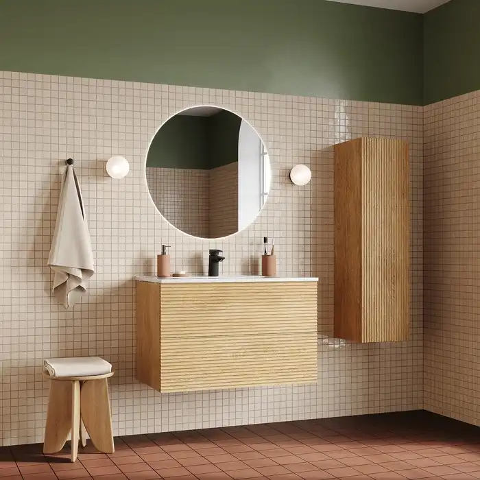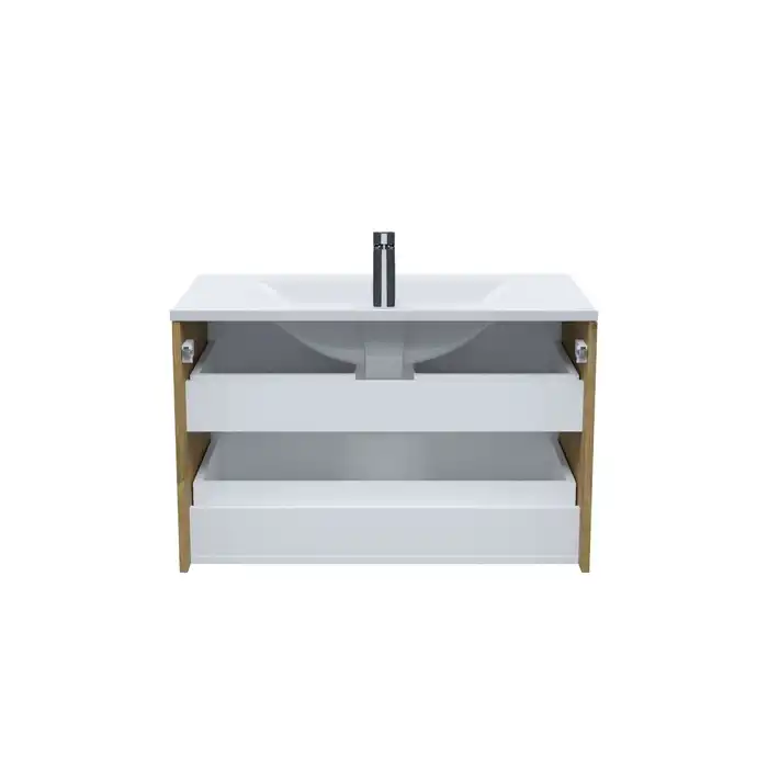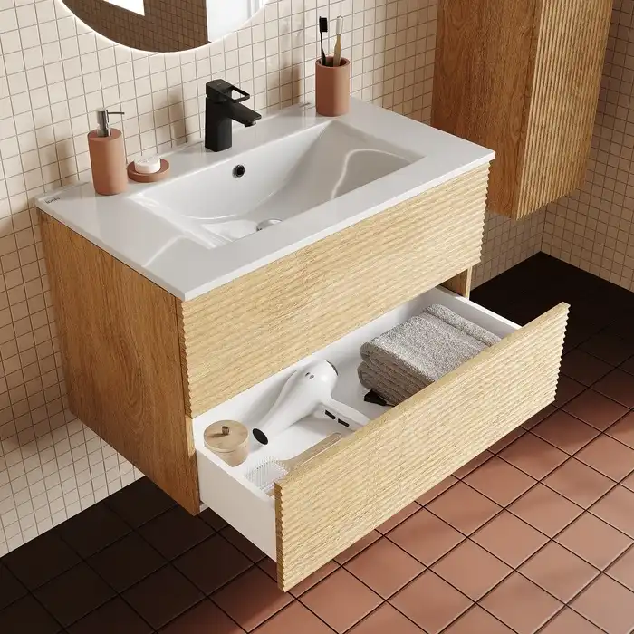 Вместительная подвесная тумба для ванной комнаты Bild с умывальником и ящиками – красивый дизайн со структурной горизонтальной фрезеровкой в сочетании с теплым оттенком дуба, удобством и практичностью. - Материал фасада – МДФ с покрытием ПВХ-пленкой. Она разработана для использования в помещениях с высокой влажностью и сохранит первоначальный вид мебели надолго (при должном уходе). Материал боковин – ЛДСП. - Керамический умывальник с высоким бортом и большой вместительной чашей в комплекте. Удобен для гигиенических и хозяйственных нужд. - Два ящика с направляющими скрытого монтажа Hettich. Фурнитура рассчитана на более 10 лет исправной работы. - Современный механизм открытия Push-to-Open – открывается нажатием на фасад. - В комплекте крепеж для монтажа тумбы. - Сифон приобретается отдельно. Гарантия на мебель IDDIS® – 3 года, на умывальник – 5 лет. (с) Авторский текст, июнь 2024 г.