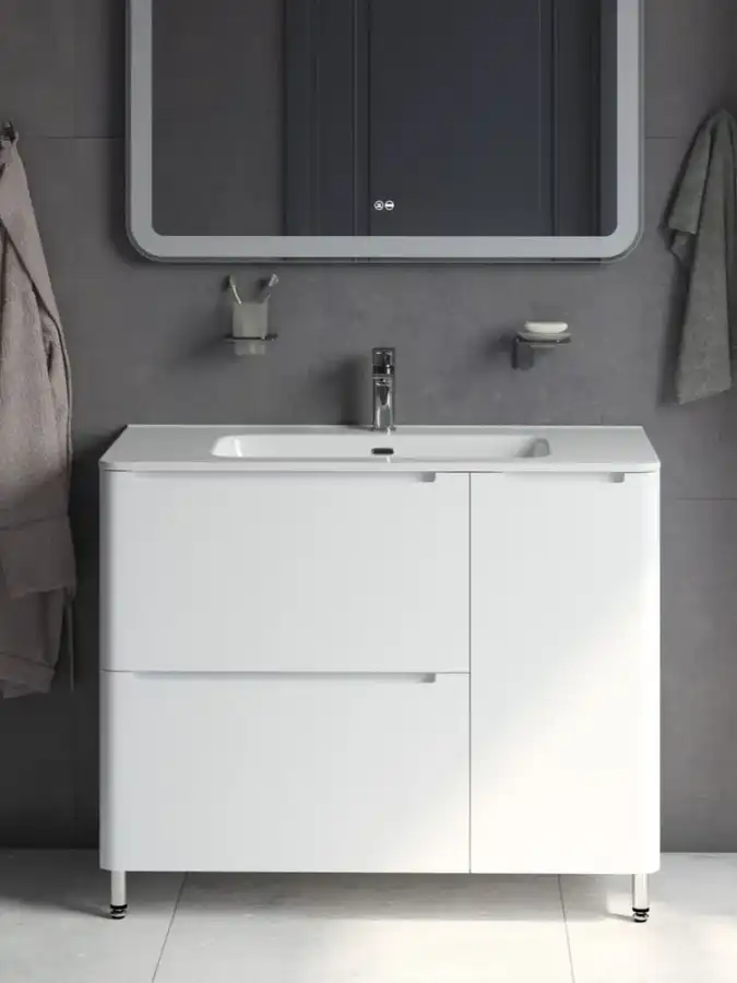 Интегрированные ручки, плоский умывальник, ящики с механизмом плавного доведения